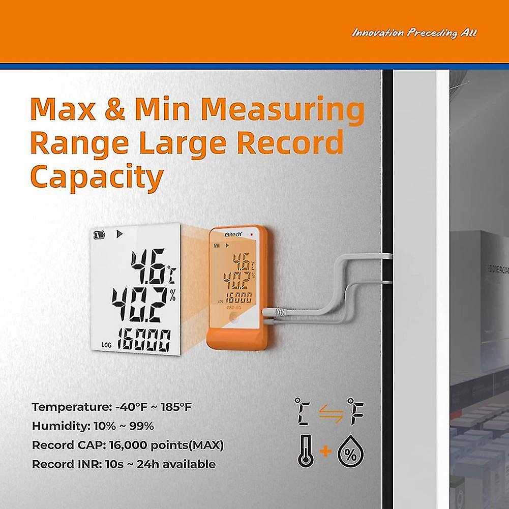 Designed for vaccine storage - Meets current CDC / VFC requirements and additional recommendations for vaccine storage and monitoring, 21 Part 11 Compliant. Easy to install - Built-in magnet, can be directly adsorbed refrigerator fixed. The advantage of the separable probe is that the probe no needs to be precooling after each time the device is moved. Glycol Bottle Buffered Probe - Avoid inaccurate temperature value caused by frequent door openings. With a wide measurement range temperature -40 to 185, humidity 10%~99%RH. Battery & USB Dual Power - Power on USB Port when battery is flat. Value Visibility - Current temperature and MAX MIN value can be obtained from the LCD screen. Parameter Settable - Temperature unit switch, Alarm Range, Logging Interval. color:As shown Material:ABS Package Contents: 1 x refrigerator thermometer Only the above package content, other products are not included. Note: Light reflection and different displays may cause the color of the item in the picture a little different from the real thing. The measurement allowed error is +/- 1-3cm.