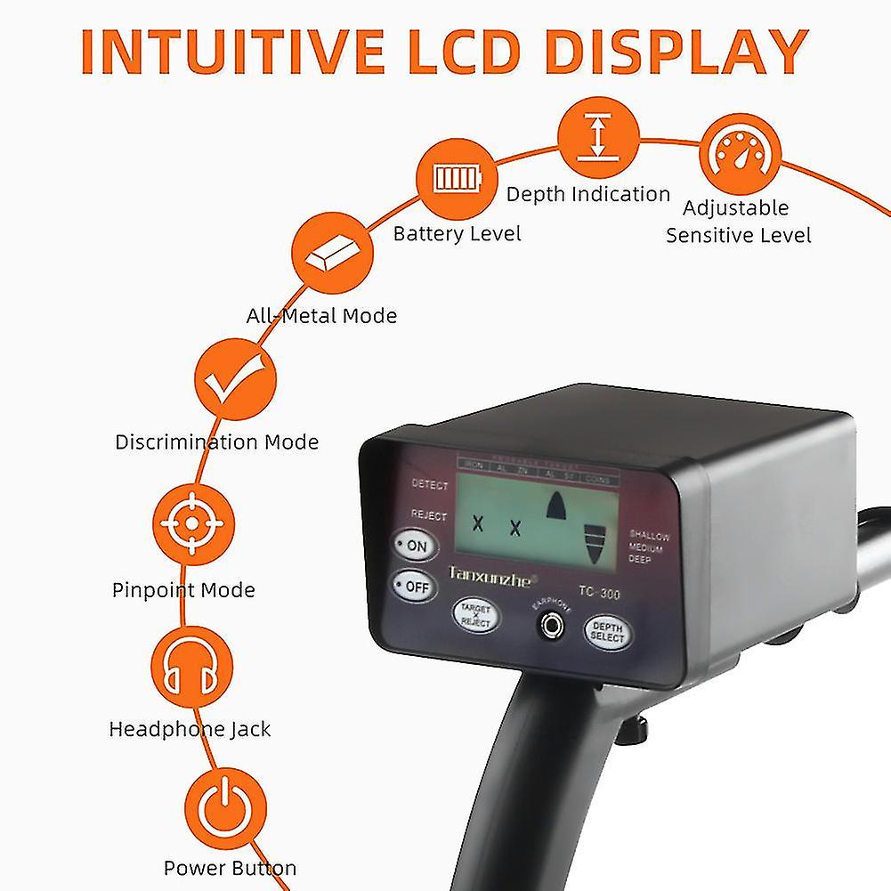Precision Metal Detector - Adjustable metal discrimination(DISC) feature lets you scan for a variety of metal types, and Automatic Ground Balance enables the detector automatically determines the best Ground Balance setting. Pinpointer & Adjustable Depth - Pinpoint helps to find exact location of target. There are 3 different sensitivity levels to choose, and LCD displays the type and depth of the target in real-time. Waterproof Coil - The 8 inches(200mm) search coil is completely submersible to let you explore the waterfront. Lightweight & Variable Height - Weighs only 1.77 pounds, and the angled arm helps you to stay comfortable on your searches. You can adjust the length of detector stem from 80cm to 115cm, fits well for adults and children to have a enjoyable experience. Battery: 9V, 2pcs (not included) Search Coil Diameter: 20cm / 8in Adjustable Height: 31.49-44.29in (80cm to 115cm) Item Weight: 804g / 1.77 lb DIY Supplies: ELECTRICAL Type: Battery-Powered Model Number: TC-300 With LCD Screen Or Not: Yes Pinpointing: With headphones IP68 waterproof: High sensitivity color:Photo color Material:plastic Package Contents: 1 x Metal Detector Only the above package content, other products are not included. Note: Light reflection and different displays may cause the color of the item in the picture a little different from the real thing. The measurement allowed error is +/- 1-3cm.