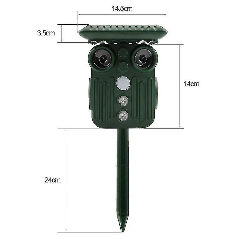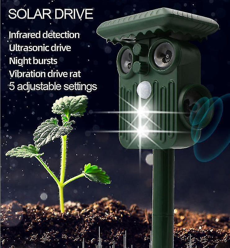 SAY BYE TO UNWELCOMED DEER With the help of Ultrasonic Solar Deer Repeller you can get rid of deer within 48 hours. Coverage Area: 30 feet to 2425 square feet.ENVIRONMENTAL FRIENDLY AND EASY TO USE: Naturally drives deer and other animals out without killing them. Made of anti-UV and waterproof material, suitable for all weather conditions. SOLAR energy technology, charge itself under sun, wireless and rechargeable. Don't worry about getting batteries anymore Repeller features FLASHING light to scare the animals. CHEMICAL FREE Protect your home from unwanted deer without the use of dangerous and messy chemicals, pesticides, sprays, or traps that can harm you, and your family. No Dead animals5 ADJUSTABLE MODES - The first mode is 13.5KHz-19.5KHz, which is used to scare away dogs and mice. The second mode, 19.5KHz-28.5KHz, is used to scare away cats and moles. The third mode, 400Hz-1000Hz, is used to scare away snakes and mice. The fourth mode is LED flashing, which is used to scare away birds and wild boars. The fifth mode is frequency conversion and LED flashing, which is used to scare away all animals including deer.