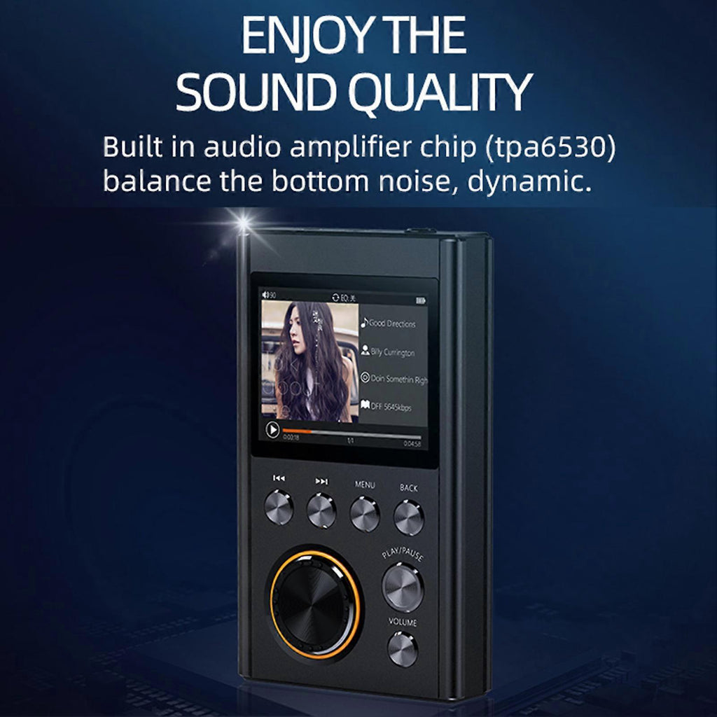 1??Lossless Sound Quality: With an SNR of 120dB, this small audio player delivers crystal clear audio, capturing every note and detail. It supports distortion-free melody in a variety of file formats, including MP3/WAV/APE/FLAC/DSD256, etc. 2??Long-Lasting: The player has a large capacity battery of 1500mAh, which can be fully charged in 1 hour and playback continuously for 30 hours. Say goodbye to constant recharging, and meet your extended listening sessions. 3??High-Clear: Adopts a 2.0" screen with a resolution of 320*240, TFT color display, the user-friendly and concise interface is clear at a glance, and the display has high color saturation that can display lyrics and song titles clearly. 4??Exquisite Craftsmanship: The unique large knob control can quickly find the track function and is very responsive. The independent menu key and return key have a one-key lock screen function, which is easy to operate. 5??Wide Use: The size of the player is: 3.94*2.2*0.59in, and the weight is about 100g. The small size easily slides in and out of any pocket, making it a great partner for your daily commute, workout sessions, or travel adventures.