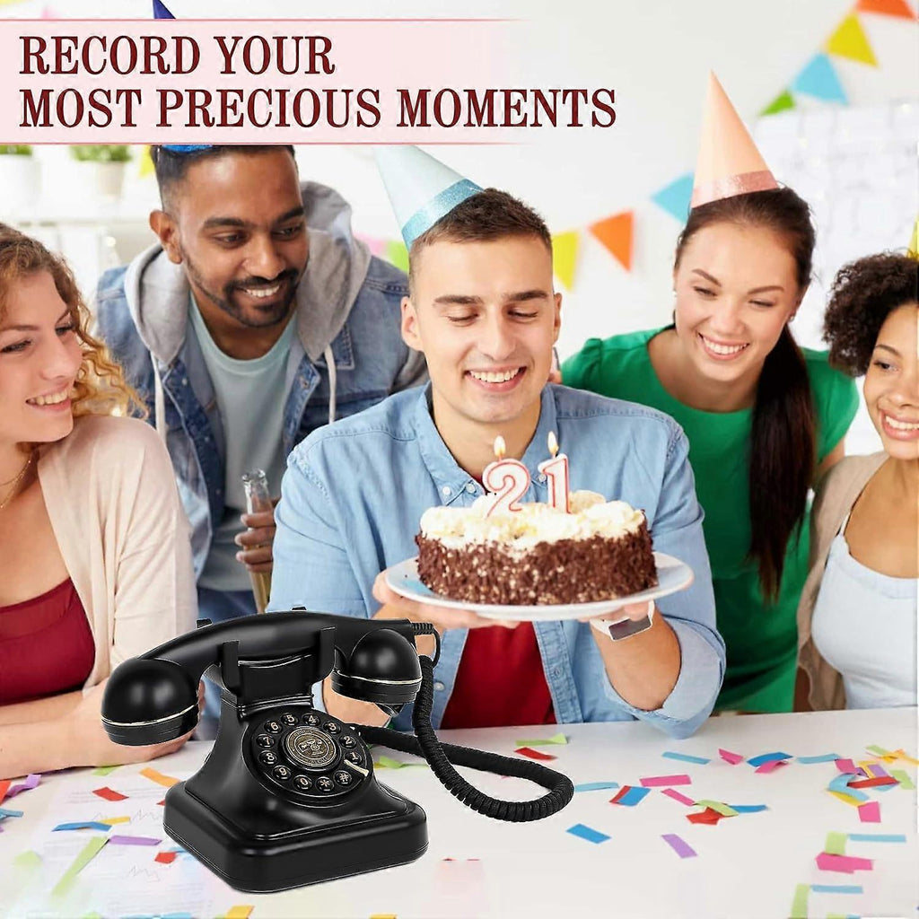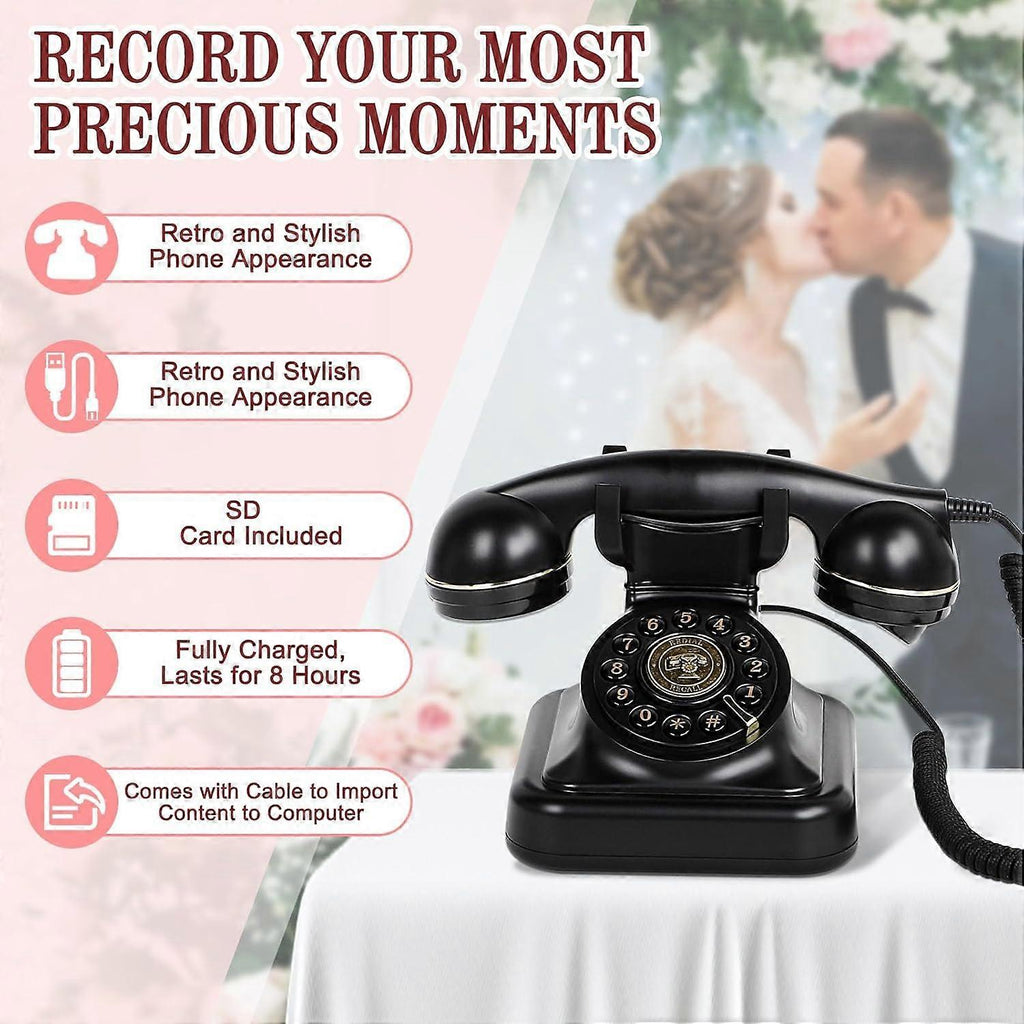 1. Why Choose Audio Guest Book? The Audio Guest Book Phone has an exquisite, stylish and retro appearance. It can stand out in all kinds of parties. This Audio Guest Book can record your most precious and sincere voice, which paper guestbooks can't do. No matter how many years later, you can hear these most memorable voice messages. They will be saved in the 8GB card and you can sync them to your phone or computer for saving and playing later. 2. What's Different About The Audio Guest Book? Unlike others, Our Audio Guest Book Wedding Phone is equipped with an upgraded microphone and speaker system, delivering exceptional audio quality for recorded messages and playback, ensuring that the sound is clear enough. The 2nd generation firmware further enhances the audio experience, providing advanced features and improved performance. 3. What Makes For Phone Guest Book In Huge Demand? Breaking the traditional paper guestbook design, our audio guest book goes beyond the written word. Messages from family, friends or guests are no longer confined to paper. The size of the body is 1:1 and the retro phone is perfectly reproduced, full of nostalgic style, suitable for various party occasions. One reports that the global audio guestbook market is expected to grow 12% annually over five years. 4. Just pick up this wedding guest book phone and hear voice messages from your family, friends or guests. Simply press and hold the center button until you hear a beep to start recording your greeting. The recording will be saved on the included 8GB card, which you can synchronize to your phone or computer for saving and playing. You can use it for yourself or as a precious gift for your family or friends.