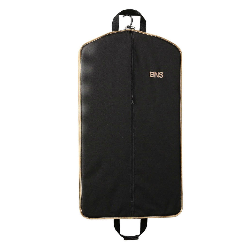 1.Featuring a patented hanger clamping system for ease in packing and convenience when traveling 2.Holds up to 6 or more garments, depending on size 3.Carrying handles fasten together with touch fastener closure and are specifically sized to attach to the trolley of a suitcase 4.Black garment bag with tan trim, measures 40'L x 22'W x 3'D with full length center zipper closure. Weighs approx 2 lbs