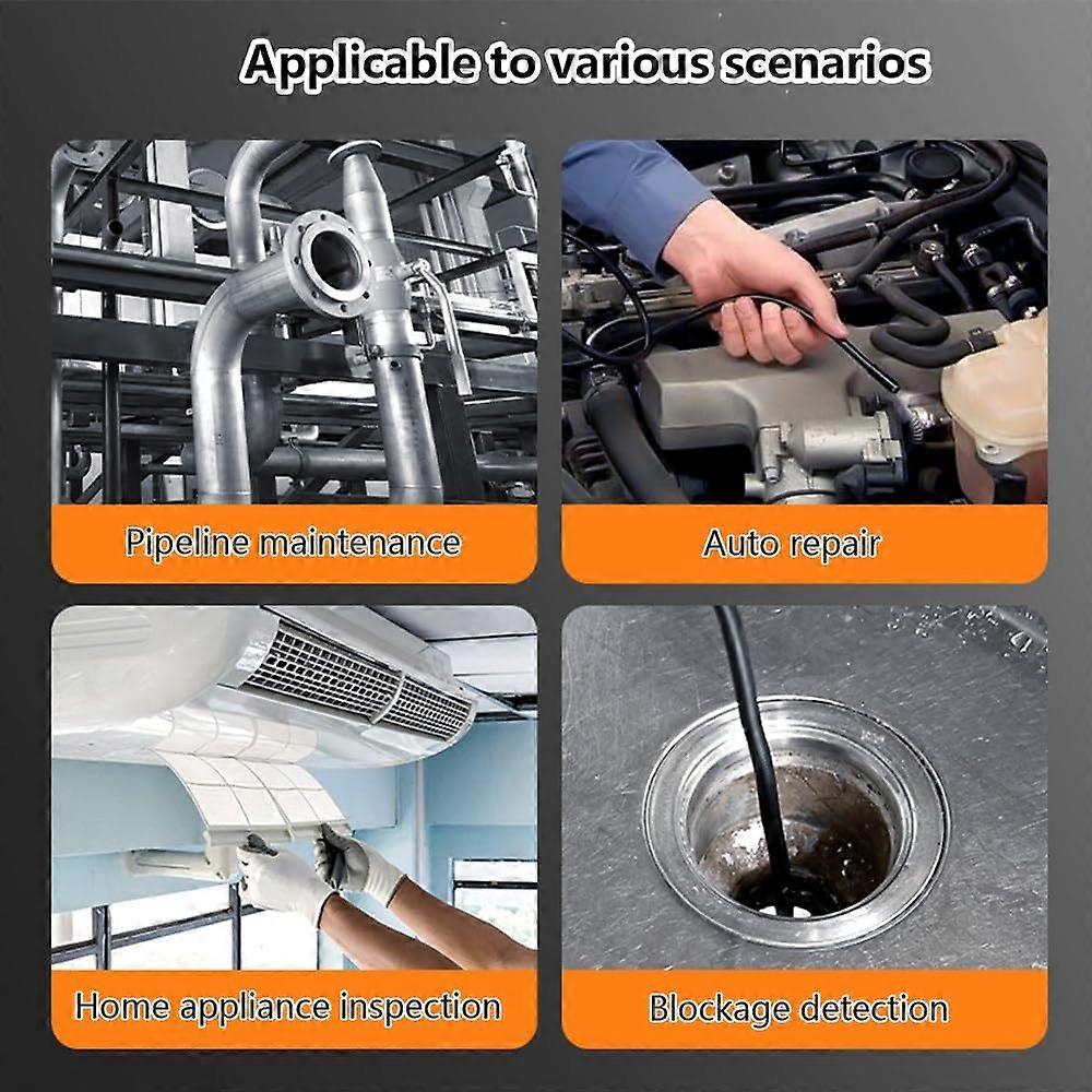 1. Flexible Lens8.5mm lens diameter, easy to penetrate into tight spaces, 210cm focal length with 170?? wide angle, clearly captures the inner details of equipment/pipe/machine. 2. Function: 5 inch large screen for easy observation; 2 million pixels, 1080P image quality, clear observation; 2000 mAh battery, battery life approx. 3 hours, full charge approx. 2.5 hours. 3. Dust and waterproof according to IP67 standard, stable use in humid environments such as car repair/sewer inspection, and the pressureresistant coil can withstand highstrength bends. 4. Adapts to multiple scenes: Suitable for maintenance scenes such as car engine inspection, cleaning air conditioning ducts, inspection of wall pipes, positioning channel blockages, etc., 5 metre long plastic coil extends the detection range.