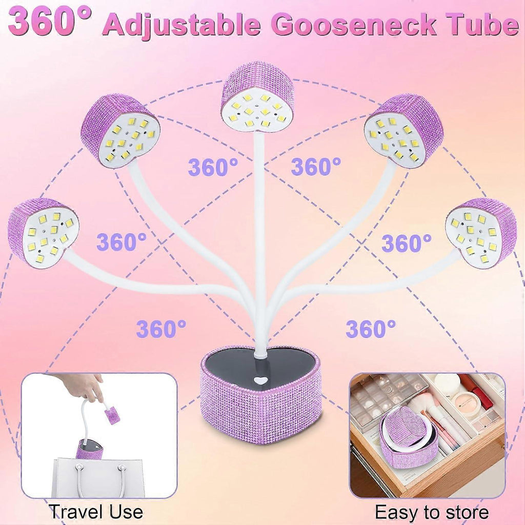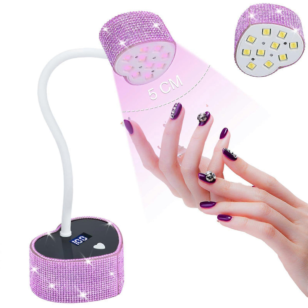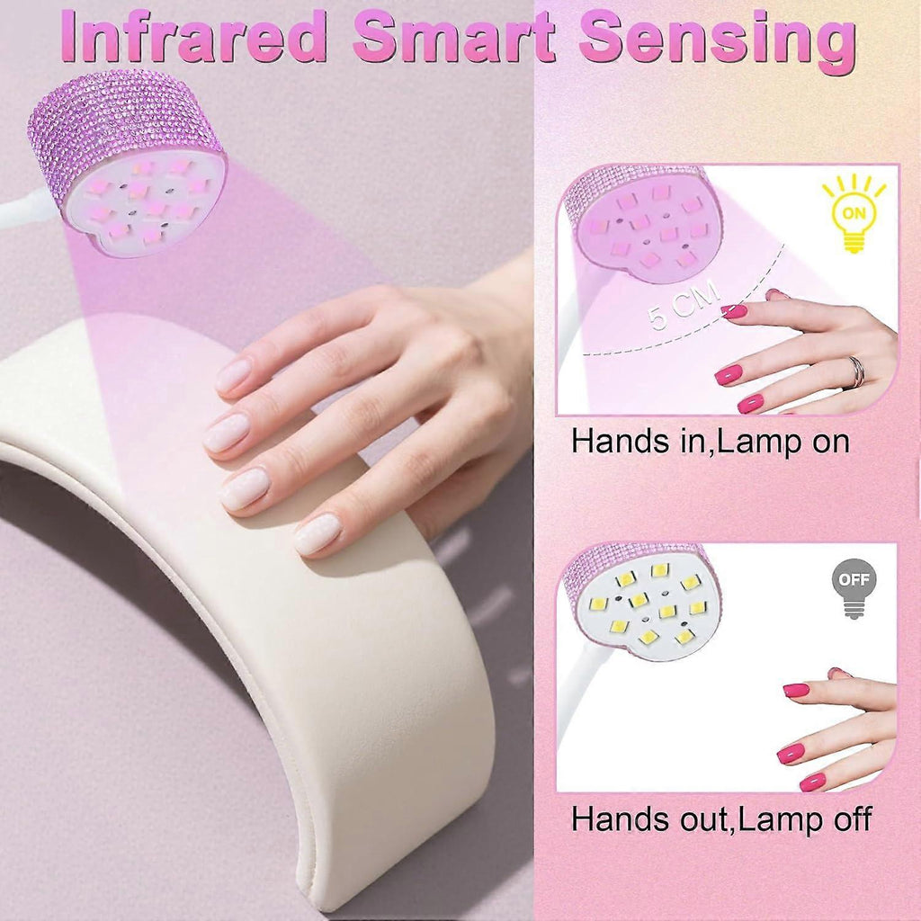 1. Fast Drying for All GelThe gel nail UV light is designed with 10 premium dual light source beads, evenly positioned to ensure fast and efficient curing from all angles. It works with all types of UV/LED nail gels, including poly nail gel, gel polish, rhinestone glue, base coat, top coat, soft nail gel, solid nail glue gel. Whether you are a beginner or a professional nail technician, you can quickly dry your nails and enjoy the fun of DIY nail art. 2. Autosensing ModeDiamond nail lamp has automatic sensor. Long press to enter autosensoring mode, hands in, light on; hand out, light off. The Intelligent infrared sensor makes manicure simple and easy, improves your manicure efficiency, and is a musthave tool for manicurists and nail salons. 3. Adjustable Flexible DesignThe long gooseneck design can be bent 360 degrees ly, ensuring you can always find the perfect position for optimal curing. The fixed base keeps the nail curing lamp stable, ing up your hands for a more relaxed and efficient nail curing. 4. 2 Timer Settings LCD Touch ControlsCordless diamond nail curing lamp comes with 2 timer settings: 60 seconds (default timer on standby, autosensing) also can choose 45s, 60s countdown, to meet all your curing UV gel nail polish needs. Builtin LCD screen will clearly show the battery capacity and timer status.
