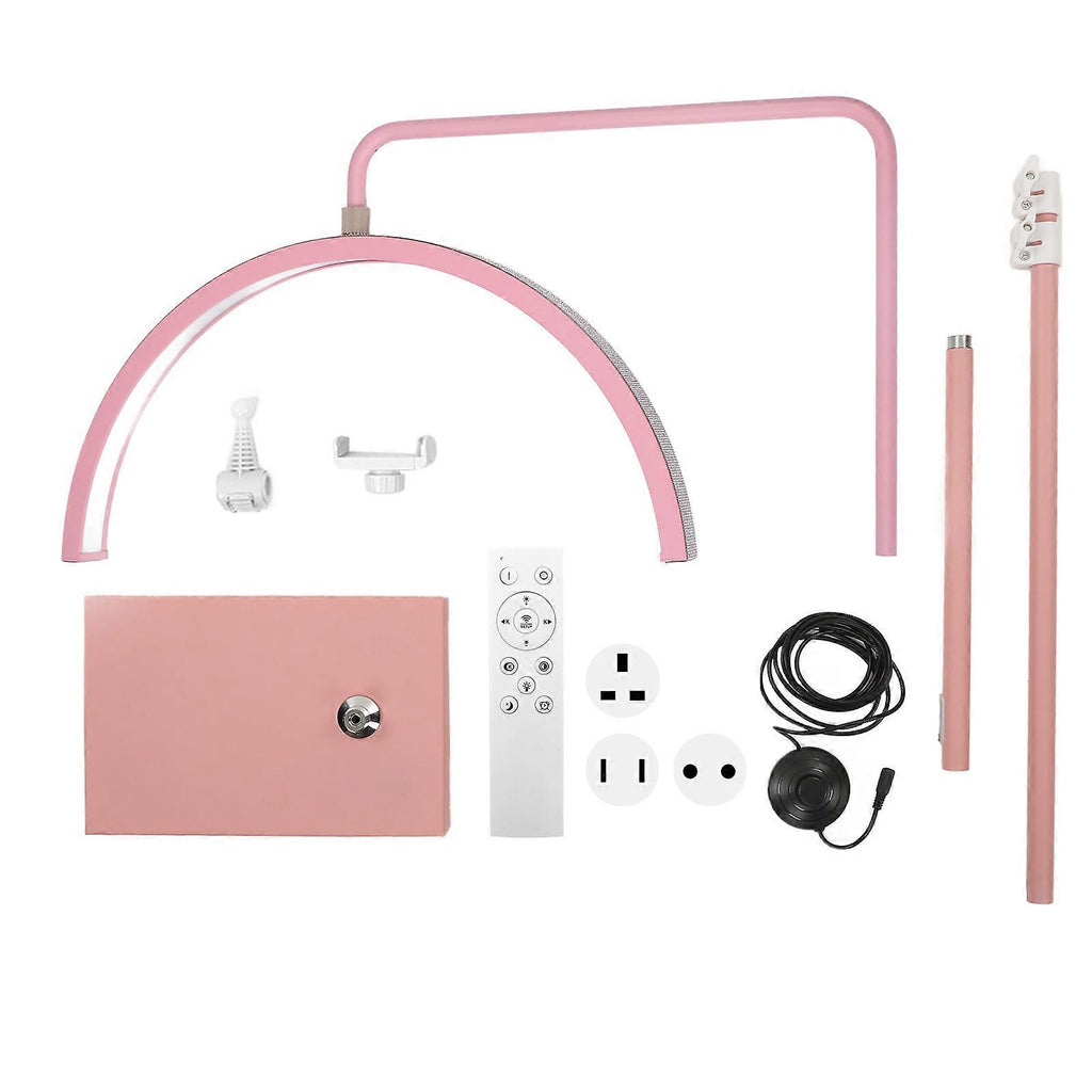 Feature:1. Enhanced Illumination: Equipped with a 22 inch lamp head designed in a moon shape. With 300 LED lights, and a 40W energy saving bulb. The lamp head can rotate 360 degrees, allowing for easy positioning and operation.2. Adjustable Brightness: Featuring a foot pedal switch and a convenient remote control, and the adjustable color temperature ranges from 2700K to 5600K, while the brightness can be adjusted from 0100% for each mode.3. Eye Protection: Half moon beauty lamp produces a soft, flicker free and shadowless light that is gentle and easy on the eyes during long operation periods for beauticians.4. Convenient Assembly: Removable and height adjustable supporting pole making it easy to assemble and disassemble while taking up minimal storage space and allowing beauticians to find the perfect height for adequate lighting.5. Stable Base: Featuring a square shaped weighted base, this lamp offers steadfast stability and will not tip over easily. The sponge design at the bottom of the base ensures that it does not slide on any surface.6. Versatile Functionality: Included with a phone holder, this lamp can be used in tattooing, eyelash extension, and nail and makeup art to tap into the potential of live streaming and video recording.Specification:Item Type: Half Moon LampMaterial: Aluminum, Metal, PVCAdapter Input: 100-240V, 50/60HzAdapter Output: 24V, 2ARemote control batteries: 2 x AAA batteries (not included)Power: 40WSwitch Mode: Foot switch control or remote controlSize:Adjustable Height: Approx. 130 ~ 180cm / 51.2 ~ 70.9inBase: Approx. 30 x 20 x 3cm / 11.81 x 7.87 x 1.18inLamp Head Width: Approx. 56cm / 22inLamp Head Connection Rod Length: Approx. 45cm / 17.7inLEDs: 300pcsColor Temperature: 2700-5600KAdjustable Brightness: 0-100% DimmingColor Rendering Index: RA>95Luminous Flux: 2520LMIlluminated Area: 5-10 square metersAverage Lifespan: 50000 hoursApplicable Places: Home, beauty salons, nail art, eyelash extension, microblading, tattooing, dentistry, etc..Package List:1 x Light Head1 x Extendable Support Rod1 x Fixed Support Rod1 x Base1 x Adapter1 x Connection Cable1 x Remote Control1 x Cell Phone Holder Clamp1 x Cell Phone Stand Connector1 x Instruction ManualNote:Please note that the new type and old type of this product will be sent randomly, and make sure you will not mind before ordering.