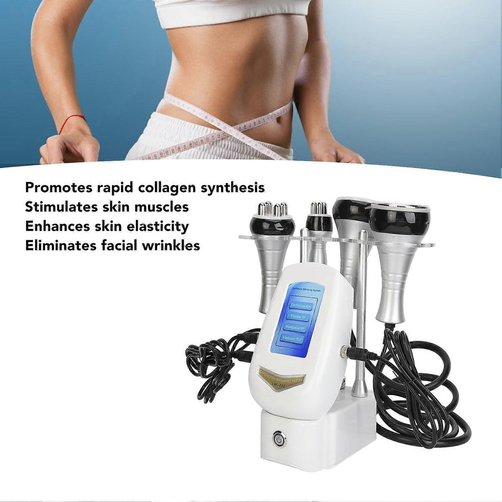 Feature:1. Wrinkle Reduction: Multi head massage function of this body shaping device stimulates collagen synthesis, promoting skin stimulation and enhancing skin elasticity. Say goodbye to facial wrinkles and enjoy tighter, firmer skin.2. Versatile: With 4 different massage heads, cavitation slimming machine is suitable for all skin types and targets various body areas such as the arms, legs, thighs, buttocks, and abdomen. Achieve a sculpted figure and improved muscle tone.3. User Friendly: The color touch screen interface allows for easy operation and customization of strength, frequency, and time settings. Use it at home or in professional settings like beauty salons and spas for effective and convenient body shaping.4. Enhanced Skin Health: This body shaping and slimming device not only reduces fat deposits but also promotes collagen production, resulting in improved skin health, increased radiance, and the elimination of wrinkles.5. Safe And Comfortable: The ergonomic design of cavitation machine ensures a comfortable experience during use. It is non invasive, non surgical, and delivers visible results without discomfort or downtime.Specification:Item Type: 4 In 1 Cavitation MachineMaterial: ABS, metalNegative Pressure RF Head: Scraping, Cupping, Sufficient Suction, Negative Pressure RF, Fat Bursting, Body Sculpting40K Probe: High frequency vibration to burst fat cells, with product import for body sculpting4 Pole RF Head: Body lifting and tightening, promote collagen synthesis, enhance skin elasticity, eliminate facial wrinkles, tighten skin3 Pole RF Head: Activate skin cells, stimulate fibroblasts to quickly synthesize collagen protein, remove wrinkles, firm and whiten skin, shrink pores, remove yellow skin, remove facial edema, improve facial contour.Package List:1 x Main Unit2 x Stainless Steel Tubes1 x Adapter1 x Plug1 x Stand1 x Instruction1 x Fat Bursting Head1 x 4 Pole RF Head1 x 3 Pole RF Head1 x Negative Pressure Head