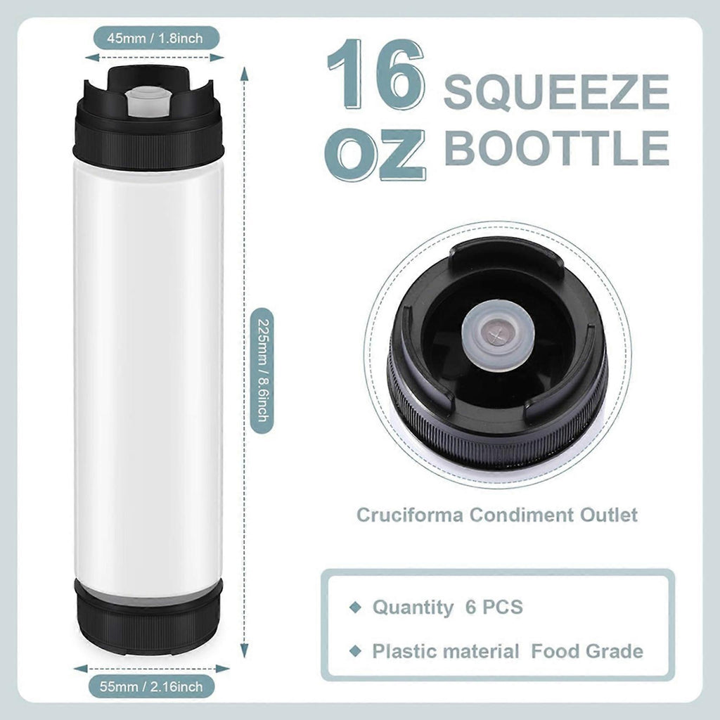 Innovative Leak-Proof Design: Featuring a robust silicone valve at the discharge port, these squeeze bottles prevent leaks when inverted, ensuring hassle-free use in any orientation. Their practical design simplifies daily tasks, making them ideal for a variety of condiments and sauces. Generous Quantity and Compact Size: This 24pcs 16 oz bottles with sleek black lids, each measuring 8.3 inches in height and 2.4 inches in width. The slim, space-efficient design ensures they fit easily in any kitchen or service area without cluttering space. and Safe Materials: Constructed from high-quality plastic, these condiment squeeze bottles are both reliable and reusable. Their soft, elastic nature allows for easy squeezing and quick shape recovery, saving time and effort during busy meal preparations. Convenient Inverted Storage: Designed with an inverted , these bottles keep the dispensing port downward to prevent dust accumulation. The bottom cover can be opened for easy refills, enhancing kitchen efficiency and hygiene. Ease of Use and Maintenance: Equipped with large double valve lids approximately 2 inches in diameter, these bottles simplify refilling and cleaning processes. The translucent white body helps in quickly identifying contents and checking fill levels. Colour:Black Material:Plastic Package Contents: 24x Double-ended sauce squeeze bottle Only the above package content, other products are not included. Note: Light reflection and different displays may cause the color of the item in the picture a little different from the real thing. The measurement allowed error is +/- 1-3cm.