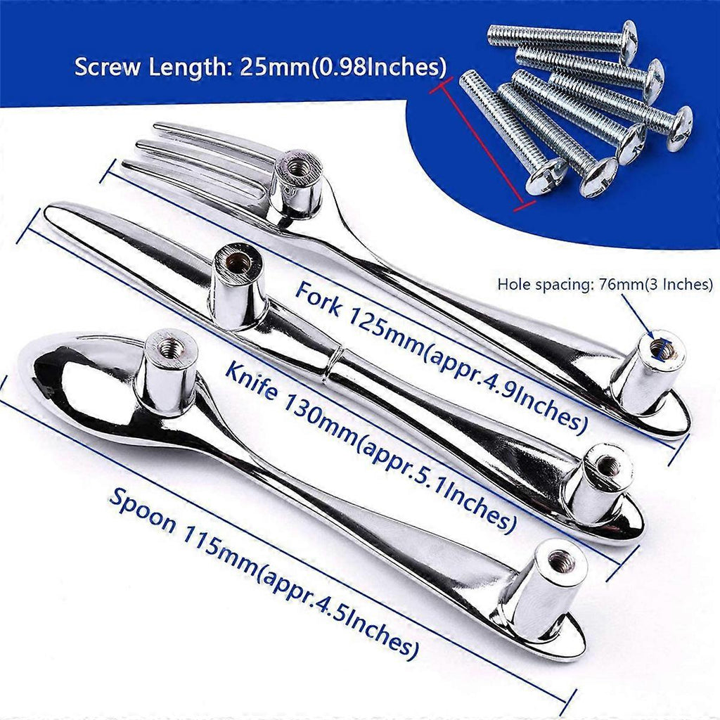 and High Quality Fine workmanship and perfect style. Background: bright chromium on the alloy . size: is 130mm, the fork is 125mm, the spoon is 115mm. Material:Zinc alloy colour:Silver Package Contents: 24 x Pull Handles with Matching Screws(8 x Fork, 8 x Spoon, 8 x Knife) Only the above package content, other products are not included. Note: Light reflection and different displays may cause the color of the item in the picture a little different from the real thing. The measurement allowed error is +/- 1-3cm.