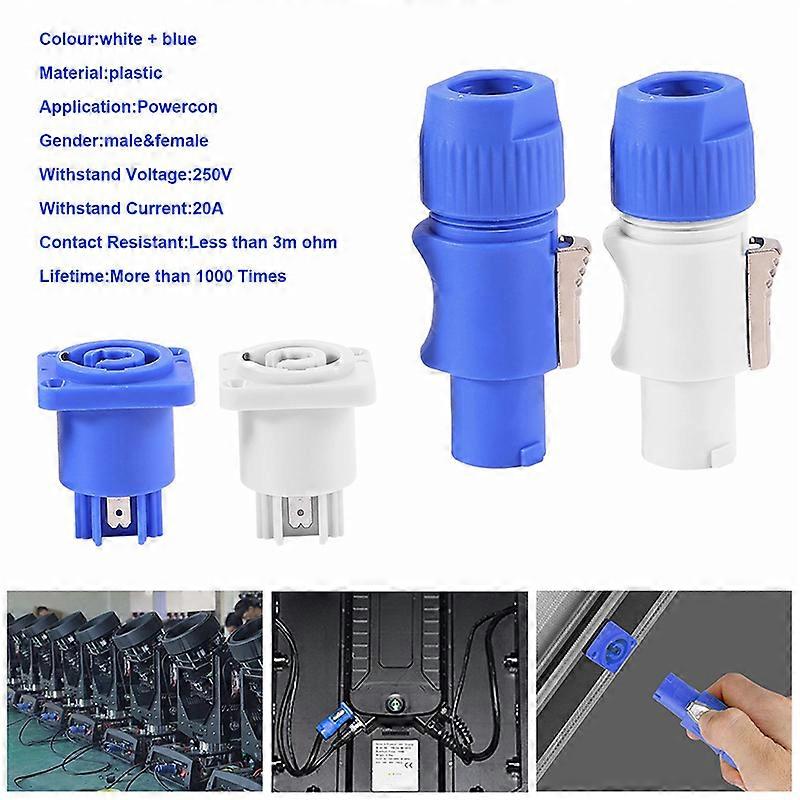 Application:Powercon Gender:male&female Withstand Voltage:250V Withstand Current:20A Contact :Less than ohm :More than 1000 Times Colour:As Shown Material:Plastic Package Contents: 30 * Chassis plug (15 blue+15 white) Only the above package content, other products are not included. Note: Light reflection and different displays may cause the color of the item in the picture a little different from the real thing. The measurement allowed error is +/- 1-3cm.