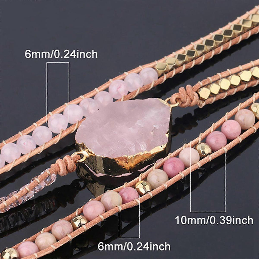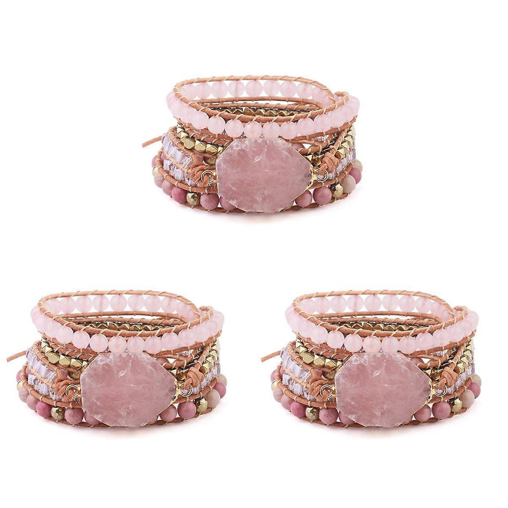 3X Natural Stone Bracelet Pink Quartz Leather Wrap Bracelets for Women Rose Gems Crystal Beads Jewel