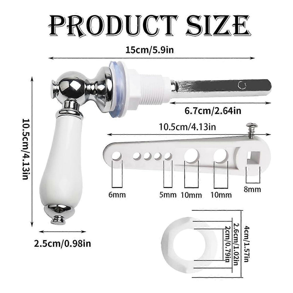 [What You Get]: The package of ceramic toilet flush handle includes 4 x water tank handle (length: 85mm), 4 x plastic insulating sleeve (diameter: 40mm), 4 x fixing nut (length: 15mm), 4 x water tank lever arm (length: 105mm/rod hole diameter: 5mm/6mm/10mm). [ Material]: Our replacement metal handle for toilet is made of Metal metal, chrome plated, and not easy to break, you can use it with confidence. [Easy to Install]: Our water tank lever handle adopts traditional design, with screw fitting sand easy installation update which can time in busy work. [Applicable to Most Toilet Tanks]: Our Ceramic Toilet Handle Replacement suitable for most toilet tanks, with exquisite appearance, it is a good helper necessary for the home. Colour: White Material: Metal Package Contents: 4 set x Toilet Flush Handle Only the above package content, other products are not included. Note: Light reflection and different displays may cause the color of the item in the picture a little different from the real thing. The measurement allowed error is +/- 1-3cm.