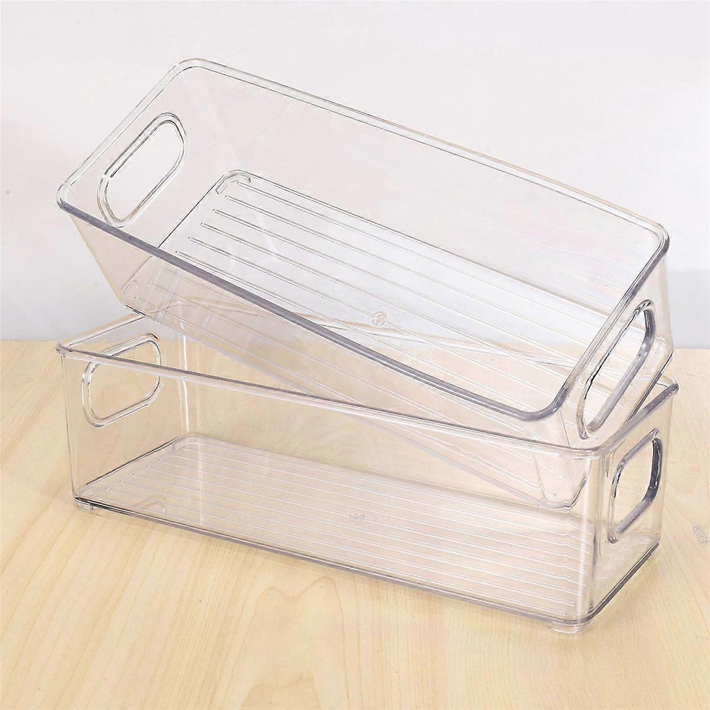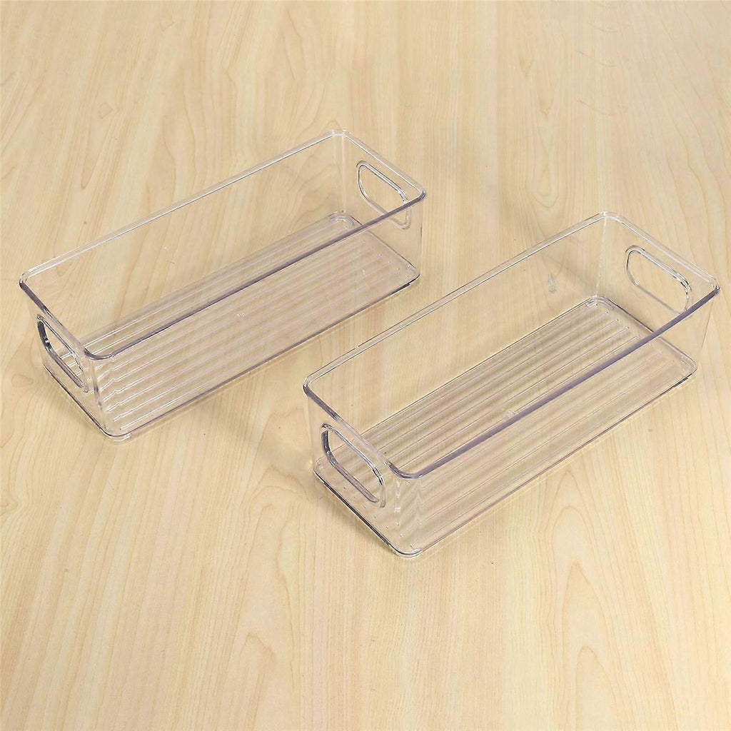 Keep your refrigerator, freezer, countertops, kitchen cabinet or pantry neatly organized with these stackable fridge organizer pantry storage bins Perfect sized to fit pouches, food packets, juice boxes, jars, , bottles, canned goods, fruits, yogurts, cheese, and more. Also good for storing dry goods in the pantry. Perfect for kitchens, pantry shelves , cabinets, or as drawer organizers. Great for closets, bedrooms, bathrooms, laundry rooms, craft rooms, mudrooms, offices, play rooms, garages, or any room of your home / apartment / condo / dorm room / RV or Practical stackable design to help maximize your space. Stack or use them side by side to keep items organized and easy to find. Made of high quality plastic. Designed with practical carry handles and interior non slip texture. Clean with warm soapy water. DO NOT PLACE IN DISHWASHER colour: transparent Material: plastic size: 26x7x9cm Package Contents: 6 x refrigerator organizer bins Only the above package content, other products are not included. Note: Light reflection and different displays may cause the color of the item in the picture a little different from the real thing. The measurement allowed error is +/- 1-3cm.