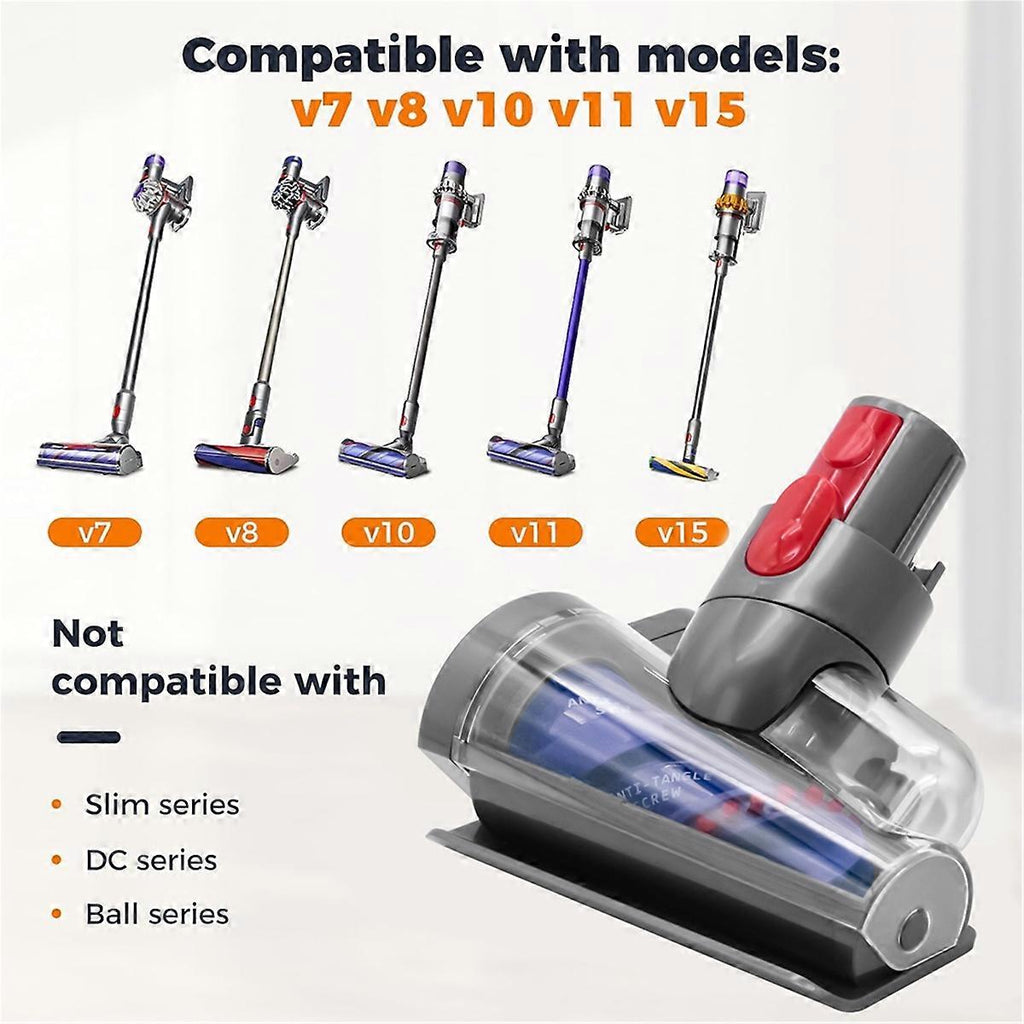 [Fit Models]The Mini Motorized Tool Brush Head Compatible with for V7 V8 V10 V11 Cordless Stick Vacuum Cleaners. Please check your machine model before ordering. [Pemium ABS+ Materials]Made of high quality ABS materials and a reinforced motor inside, ensuring long-lasting durability and resistance to use. [One Click Installation]Our Mini Motorized Brush features a quick-release buttom, allowing for effortless and secure attachment to your for vacuum cleaner. No tools or additional parts required! [Strong Suction]The design of the reinforced motor is adopted, the suction power is greatly improved, and the cleaning is stronger. Picks up pet hair and large debris on mattresses, couches, curtains, and other fabrics, easily save your time. Colour:As Shown Material:ABS Package Contents: 1 x Electric Mattress Dust Mite Removal Brush Only the above package content, other products are not included. Note: Light reflection and different displays may cause the color of the item in the picture a little different from the real thing. The measurement allowed error is +/- 1-3cm.