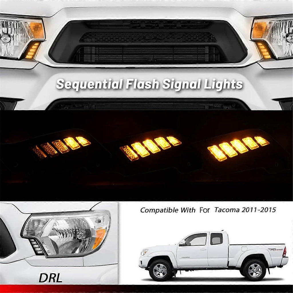[Fitment]Compatible with for Toyota Tacoma 2011 2012 2013 2014 2015. [Dual Color Design]White Light is Daytime Running Light; Amber Light is Turn signal light. [Installation]Connect the Black wire to the negative, Red wire to the running light positive, Yellow wire to the turn signal positive. [More Secure]part number style with directly replacement, Provides you with a decisive safety leap in road traffic and helps prevent of accidents. Colour:black Material:ABS Package Contents: 2 x Daytime Running Light Only the above package content, other products are not included. Note: Light reflection and different displays may cause the color of the item in the picture a little different from the real thing. The measurement allowed error is +/- 1-3cm.