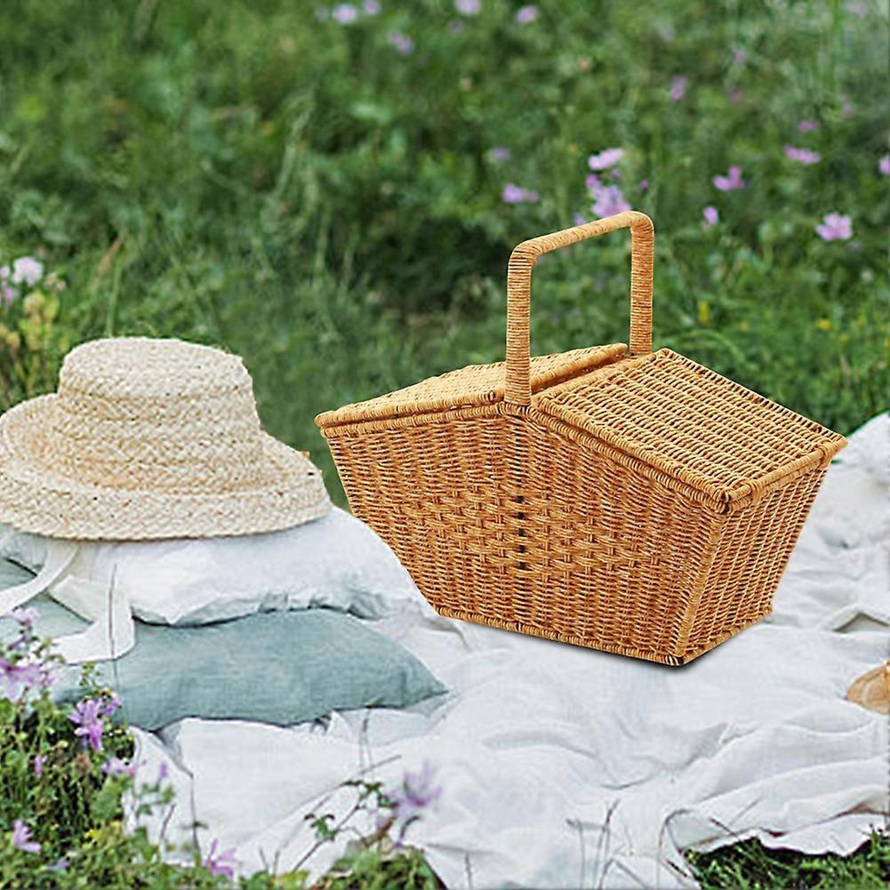 (Yellow) Pastoral Style Hand Basket with Lid Imitation Rattan Woven Picnic Basket Fruit Snacks Sundries Stora