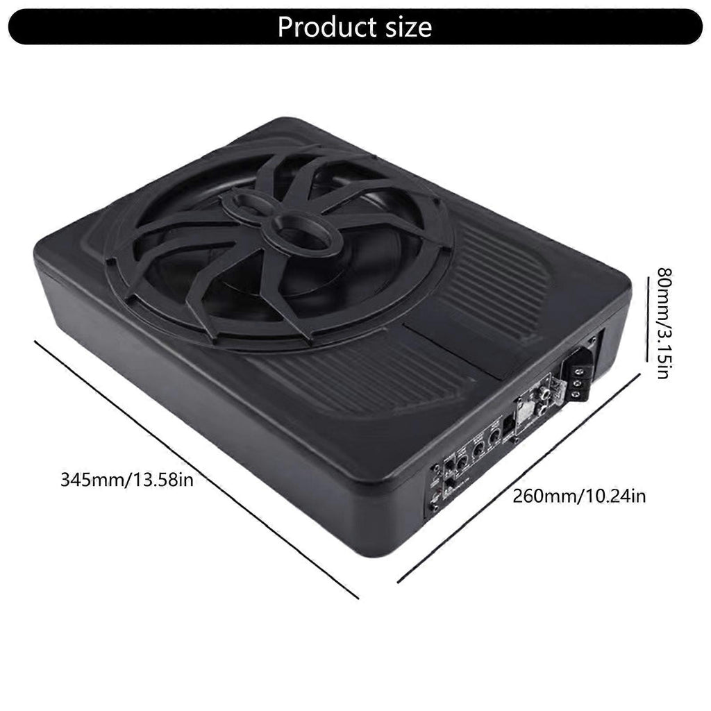 Features: Perfect for vehicle sound enthusiasts and consumers seeking a personalizing and stylish in car atmosphere, this subwoofer delivers immersive sound experience. The under seat subwoofer is a 10in active car truck subwoofer with a built in amplifier, housed in a aluminum casing for outstanding heat dissipation performances. Featuring a speaker protector and speaker LED ambients light rings design, this car subwoofer adds a touch of style with LED lights that illuminate upon vehicle start up, give your car a cool appearance. The car subwoofer comes with a wired bass volumes remote controller, bass boosts, and crossovers controls to deliver a stunning bass experience with a power of 800W. The subwoofer supports low level input and is for high level input, adjustable input sensitivity, along with thermal, short circuit, and overload guard circuits. Specifications: Component:Aluminium Size:Approx.345x260x80mm/13.58x10.24x3.15inch Color:Black Power: 800W Impedance: 2.6?? Low Pass Filter: 50Hz-150Hz Bass Boosts: 0 to +12dB Frequency Response: 50Hz-150Hz Signal to Noise Ratio: >90dB Package Includes: 1 Set Car Subwoofer note: 1.Please allow 1-2cm errors due to manual measurement, make sure that you donot mind befores you order. 2.Due to the differences between different monitors, the picture may not reflect the actual color. Thanks for your understandings.
