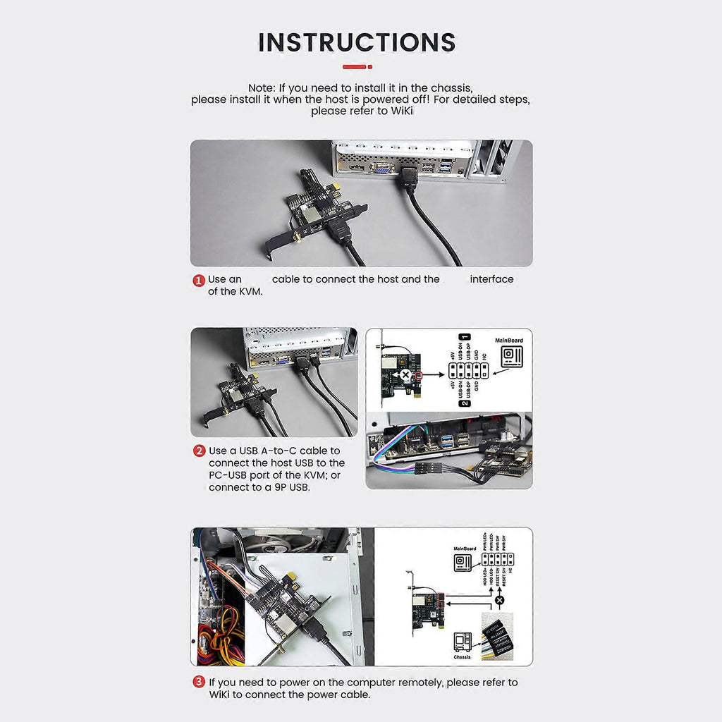 Features: The KVM PCIe Basic Kit offers a new form of KVM with integrated PCIe bracket, providing desktop users enhances stability and performances. Featuring optional WiFi and Power over Ethernet capabilities, the KVM PCle is equipped with its own PCIe slot for power from the motherboards, ensuring reliable corded connection (Ethernet) for professional demands. For IT administrators, data center technicians, and professionals requiring remote control solution?? this kit caters to advanced technical needs. Perfectly for maintenances, data center management, and enterprises level IT environment, the KVM PCle enhances device monitoring and operational efficiency. With its durability and versatiled functionality, this development board accessory is a must for seamlessly integration and superior control in their setups. Specifications: Item: KVM PCIe Basic Kit Component:6.6x5.7cm/2.6x2.24in Resolution??1080P 60fps Video Encoding: MJPEG H264 Ethernet??100m/10m Power?? 0.2A 5V Optional Package??Not Support Power over Ethernet and WIFI/Support Power over Ethernet and Not with WIFI/ Not Support Power over Ethernet Support WIFI/Support Power over Ethernet and WIFI Package Includes: KVM PCIe Basic Kit note: Due to problems of lighting effect there will be certain tolerances in product, please understand. Please allow 0-1cm error due to manual measurement