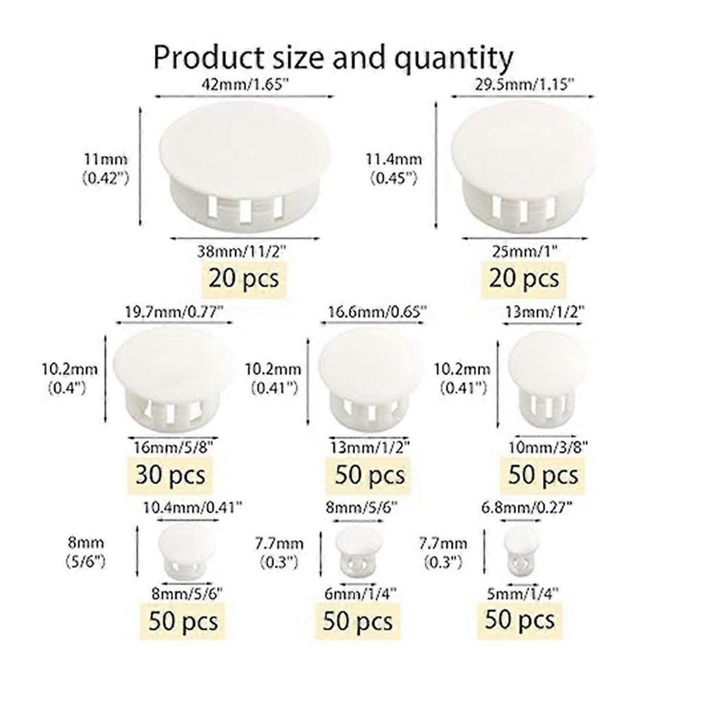 320 plastic hole plugs. Flush hole plugs include 8 sizes: 5mm 50 pcs, 6mm 50 pcs, 8mm 50 pcs, 10mm 50 pcs, 13mm 50 pcs, 16mm 30 pcs, 25mm 20 pcs, 38mm 20 pcs, we provide sizes of hole cover plugs, to meet your different needs. The panel hole plug is made of high-quality plastic material, which is , wear-, not easy to break, and has a long service life. The high-quality plastic plug with round hole adopts buckle design, which is not easy to fall off and is very stable after installation. Great for filling, , covering and decorating holes no auxiliary tools required. You just need to select the corresponding hole plug according to the size of the hole, and then it into the hole to complete the installation. These plastic grommet covers are suitable for steel furniture, cabinets, table and chair legs, brackets, electrical boxes, window frames, door panels and outdoor equipment, etc. Colour:White Material:plastic Package Contents: 50 x 5mm plug 50 x 6mm plug 50 x 8mm plug 50 x 10mm plug 50 x 13mm plug 30 x 16mm plug 20 x 25mm plug 20 x 38mm plug Only the above package content, other products are not included. Note: Light reflection and different displays may cause the color of the item in the picture a little different from the real thing. The measurement allowed error is +/- 1-3cm.