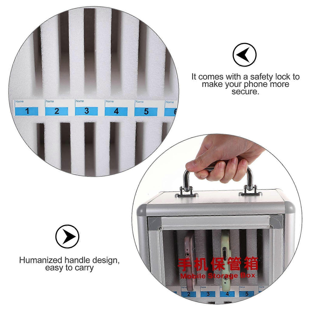 Description This is a Cell Phones Storage Cabinet. Humanized handle design, easy to carry. It comes with a safety lock to make your phone more secure. Stylish and attractive appearance is for use in conference offices, factories, schools and restaurants. Features - ColorSilver - Material: Aluminum alloy. - Size: 27.50X21.00X18.50cm/10.81X8.25X7.27in - Made of aluminum alloy, MDF and transparent , sturdy and durable, waterproof, anti-pressure. - Humanized handle design, easy to carry; It comes with a safety lock to make your phone more secure. - Stylish and attractive appearance is for use in conference offices,factories,schools and restaurants. - The built-in pearl cotton material can prevent abrasion, each cell phone slot is marked with Numbers more convenient to facilitate the search your phone; - Fashionable wall-mounted design on the back can be hung on the wall without taking up space. Package list: 1 x mobile storage cabinet
