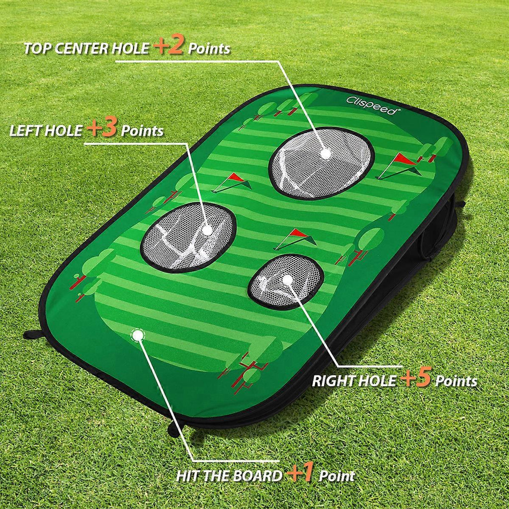 Description With a net, you can practice without worrying about disturbing your neighbors with missed shots. Going to the driving range is expensive and time-consuming. Owning a net at home can greatly help cut down your training cost, saving you time and money. Features - Brand: Clispeed - Color: As shown - Material: oxford cloth, steel wire, PU - Size: 90 x 60 x 20 cm - Cornhole diameter: 8in, 7in, 5in - This is a must-have chipping net for golfers of all levels, easy to install and convenient to carry. - Lightweight and foldable, suitable for playing indoors, outdoors, or any other place. - Thickened fabric is durable and not easy to deform, sturdy enough to absorb hits from several balls without flipping over. - Set up a game or a friendly match using the three target pockets with your family, friends or colleagues. - Help improve your short distance chipping accuracy. - With a storage bag, it can be folded to store.Package list: 1 x Clispeed target net 2 x Clispeed yellow stake 16 x Clispeed ball x 16 1 x Clispeed hitting mat x 1