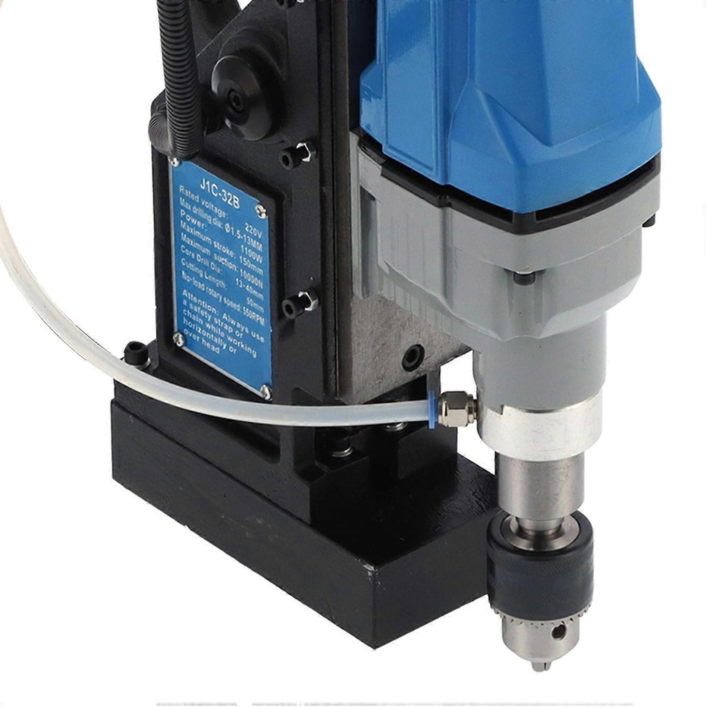 Feature: 1. The magnetic base drill is easy to operate, just press the switch to control the magnet engagement or disengagement. 2. With MT2 taper shank chuck, you can switch between hollow drills and twist drills, which is convenient and trouble?free. 3. Through the optimized no?load speed of 550RPM, adjustable speed 100?720RPM, cutting and drilling are precise and clean. 4. With 10000N strong magnetic suction force, it is generally suitable for drilling, tapping and reaming. 5. The shape is ergonomically designed to minimize operator fatigue, quickly set up and increase productivity. Specification: Item Type: Electric Magnetic Drill Model: J1C-32B Power: 1100W No-Load Speed: 550RPM Magnetic Force: 10000N Twist Drilling: Approx. 1.5-13mm / 0.1-0.5in Hollow Drilling Capacity: Approx. 12-40mm / 0.5-1.6in Drilling Depth: Approx. 50mm / 2in Travel Distance: Approx. 150mm / 5.9in Spindle Taper: For Weldon 19mm Adjustable Speed: 100-720RPM Machine Size: Approx. 28 x 16 x 50cm / 11 x 6.3 x 19.7in. Package List: 1 x Magnetic Drill1 x MT2 Chuck1 x Water Bottle1 x Hose1 x Wrench1 x Chuck Handle2 x Tight Nails1 x Thimble2 x Carbon Brush1 x Chuck Wrench3 x Handles1 x Rope1 x User Manual Note: 1.The product itself does not contain magnetism, it will become magnetism only after power on.2.Please note that the new type and old type of this product will be sent randomly, and make sure you will not mind before ordering.