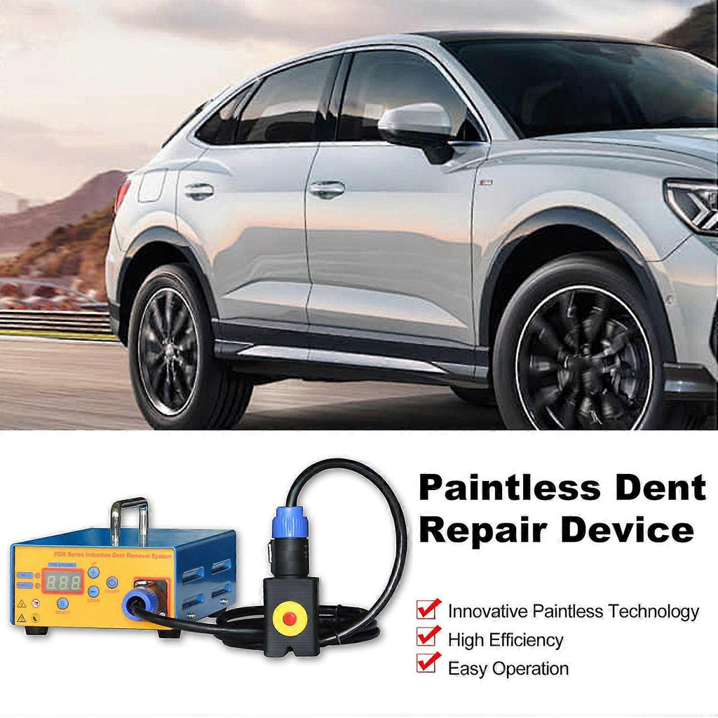 Feature: 1. ??Professional PDR System??Magnetic induction dent removal system is a innovative paintless technology. It can remove the dents, door dings and other minor soft dents on vehicles quickly and cleanly, which has a digital screen and relative control for both time and power settings. But please note that this device is only suitable for gentle dents on steel bodies and cannot repair aluminum bodies and sharp dents. 2. ??Quick Repair & No Damage Paint??It can fix the soft dents on the metal surface within 30 seconds, more than six times more efficient than manual tools. The closer to the core part, the easier it is to repair the dents. The car paint is not damaged during the repair process, so it can protect the value of your car. It is one kind of fast, convenient and professional tool, which can save time during a repair process. 3. ??Easy to Use??It is suitable for beginners and professionals alike. No need additional and extra material, it will remove a variety of soft and small dents easily by flameless heating the panel behind the paint from the outside of the panel, relieving the stress holding the dent and lifting the dent through induction thermal expansion, especially in hard-to-reach areas, or areas difficult to get behind. 4. ??Multi-Function??Paintless dent repair device has a wide application on any flat metal surface, and efficiently works on dents of motorcycles, vehicles, refrigerators, washing machines, car door dings and hail damage and other dents. Specification: Specifications: Plug: EU / US / UK / AU (Optional) Material: Iron Input Voltage: 110-120V(US), 220-230V (EU & UK & AU) Input Frequency: 50Hz ((EU & UK & AU)), 60Hz (US) Max Output Power: 1.38KW Max Output Frequency: 150KHz Adjustable Power Range: 20%, 40%, 60%, 80%, 100% Adjustable Heating Time Range: 1.0S, 1.5S, 2.0S, 2.5S, 3.0S, 3.5S, 4.0S Output Cable Length: 1.6m Item Size: 250 * 140 * 80mm / 9.84 * 5.51 * 3.14in Item Weight: 1800g / 3.96lb Package Weight: 3500g / 7.71lb Package Size: 32 * 32 * 16cm / 12.59 * 12.59 * 6.29in Package List: Package List: 1 * Repair Device Host 1 * Output Cable 1 * Power Line 1 * Dent Leveling Kit 1 * User Manual (English)