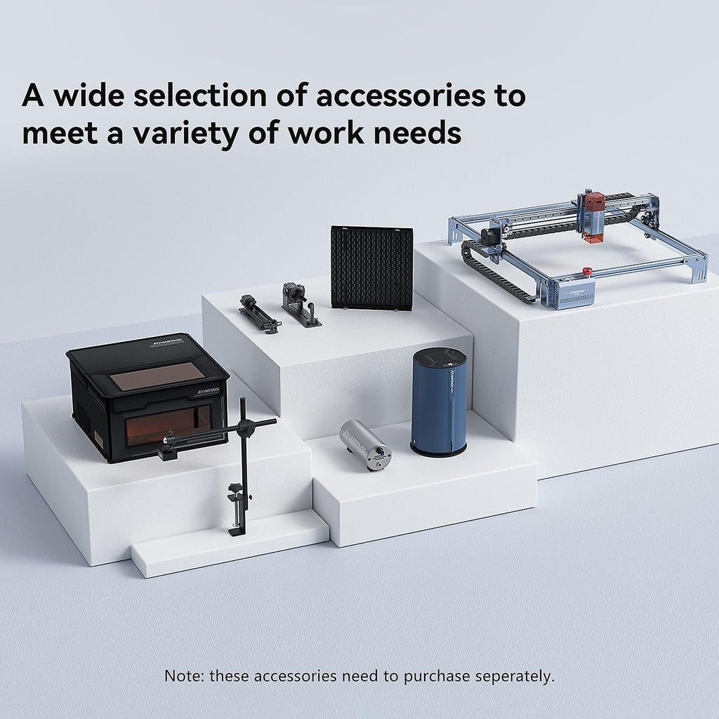 Features: ? High Speed Laser Engraver: Engraving speed is increased by 2 times: using the latest technology, it can realize 24000mm/min high-speed engraving, and the speed is increased by 2 times. Whether you are a manufacturing industry or an individual user, our products can meet your needs, improve work efficiency and shorten production time. 400x400mm large working area provides boundless creative space. ? New structure: The linear slide rail + tank chain design enhances the structural accuracy and optimizes the wiring harness arrangement, thereby improving the accuracy and stability of the product. This design can also reduce the noise and vibration of the machine, providing a better working environment. ? High Accuracy: New 50mm long focal length light source, leading cutting ability. Not only can the cutting efficiency be improved, but also the cutting quality and precision can be enhanced. ? New Focusing Device: Adjust the focal length more accurate: equipped with a new focusing device, you can adjust the focal length more accurate. This design can not only improve the cutting quality, but also make the cutting easier and more convenient. In addition, our focusing devices can be adapted to different thicknesses of materials. ? The second-generation APP control: Adopts the second-generation APP control, including cutting model material library, rich design functions and stable connection control. This design allows users to operate the laser cutting machine more conveniently, improving work efficiency and cutting quality. ? Upgraded dual compression spot coupling technology: the ultra-fine laser focus area is reduced to 0.06*0.06mm, and the high-density laser can easily cut 18mm balsa wood, 13mm paulownia wood, 6mm basswood plywood and 15mm thick black acrylic; it can directly engrave mirror stainless steel, ceramics, glass, etc., the engraving & cutting speed is 40% higher than that of the non-spot compression model, which is comparable to the effect of a 150W CO? laser engraving machine. ? Excellent Engraving and Cutting Ability: 10-12W laser power. Great for carving basswood pine paulownia, plywood, yellow peach, aluminum oxide, non-reflective electroplated and painted metal, 304 mirror stainless steel, glass, ceramics; And cutting cork, low-density foam board, non-transparent acrylic and so on. ? Extensive Compatibility: The machine is compatible with various mature engraving software, such as LaserGRBL, LightBurn, supports Win XP / Win 7 / Win 8 / XP / Win 10, and also supports MAc system (LightBurn), engraving file format Support NC, BMP, JPG, PNG, DXF, etc. ? Safety Protection: The new panoramic filter protective cover can protect your eyes very well, filtering 97% of ultraviolet light, you and the people around you can watch the laser without wearing goggles Sculpture. Reduce your goggle expense and inconvenience of wearing goggles. ? Strong Expandability: You can choose to add a type of protective box, rotating shaft accessories, purifiers, extension shafts, cameras, cross laser positioning, flame detection modules, horizontal gyroscopes and other accessories are optional (purchase separately). Specification: Product model: ATOMSTACK Maker A10 V2 Engraving size: 400*400mm Laser power: 50W Laser output optical power: 10-12W Laser wavelength: 455??5nm Engraving accuracy: 0.01mm Focusing method: fixed focus laser, no focusing Laser focus: 0.05*0.05mm Product material: circuit board V/PWM modulation board Wire: 22 2P2.54 terminal reverse wire 80mm Optical lens: ??6/glass Fan: 12V Laser Beam Mode: Spot Working mode: pulse work Spot size: 0.05*0.05mm Working time: 10000H Working temperature: 0??~70?? Storage temperature: -40??~85?? Sintering temperature: 800??C Engravable/cuttable materials Carving material: Basswood pine paulownia, plywood, yellow peach, mahogany, bamboo, kraft paper, plastic, leather, PCB board, aluminum oxide, non-reflective electroplated and painted metal, 304 mirror stainless steel, glass, ceramics, cotton cloth, rock plate, Density board, kraft paper, non-transparent acrylic board, resin, artificial bovine bone, rubber, high-density foam board, oil painting paper, A4 paper, leaves, etc. Cutting material: Kraft paper, non-woven fabric, hardwood, paulownia, basswood, pine, less than 2MM bamboo, cork, low-density foam board, non-transparent acrylic, less than 2MM thick ABS, PP and other plastic sheets, sponge, etc. Laser protective cover: there is a protectiv