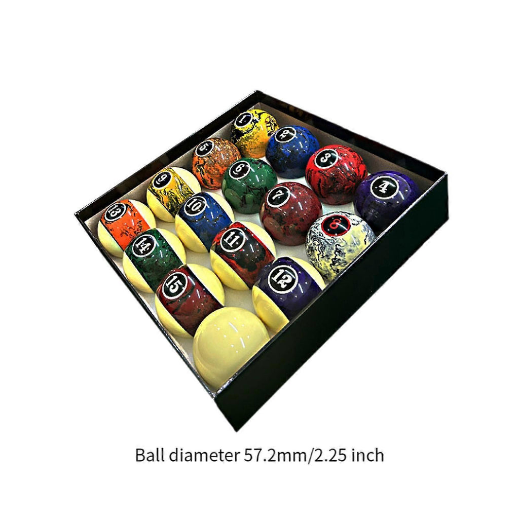 Description: Package Contents: The set includes 16 billiard balls, comprising of 15 numbered balls and 1 ball without a number. Each ball has a diameter of 5.72 cm/2.25 inchesQuality Material: These billiard balls are made from resin, ensuring stability, wear resistance, and easy maintenance to keep the balls shiny and cleanComplete Set of Numbered Balls: This set includes a full series of numbered balls, covering all the numbers required for billiards games. It is suitable for both official matches and training sessionsAppearance: Each ball has a smooth surface with bright colors and clear numbers on them, providing an enhanced visual effect that adds to the atmosphereWide Application: This complete set of billiard pool table balls is widely applicable for club, bar, game rooms, sports leisure activities etc Specification: Material: Resin Size Chart: Ball Diameter: 5.72 cm/2.25 inch Package Includes: 16Pool Table Balls Note: Please allow slightly errors due to manual measurement and different monitors.