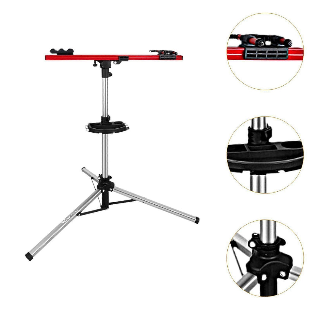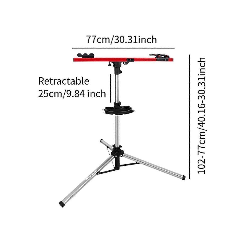 Description: Premium Aluminum Alloy Structure: This bike repair stand is made of aluminum alloy, providing strong load bearing capacity and durability. It is suitable for 16-29 inch mountain bikes and road bikes (not suitable for barrel axles)Adjustable Height, Tool Tray Design: The height from the ground can be freely adjusted within a range of 25 cm/9.84 inch, catering to various bicycle repair height requirements. The built in categorized tool tray makes it easy to organize and access various tools, making the repair process more orderlyMulti Angle Rotation Function: The head of the bike stand supports 360 rotation, facilitating adjustments in any direction and enhancing flexibility during repairs This bike maintenance workstand can be retracted to a length of 81 cm/31.89 inch, saving space and making it easy to store at home or in the studioAnti Slip Protective Pad Design: The bottom is equipped with anti slip pads and protective pads to increase stability, and prevent sliding and scratching, ensuring safe operationProduct Dimensions: Maximum Height 102 cm/40.16 inch, Minimum Height 77 cm/30.31 inch, Width 77 cm/30.31 inch, Adjustable Range 25 cm/9.84 inch Specification: Material: Plastic Aluminum Alloy Size Chart: Maximum Height 102cm/40.16inch;Minimum Height 77cm/30.31inch;Width 77cm/30.31inch;Adjustable Range 25cm/9.84inch Package Includes: 1Bike Repair Stand Note: Please allow slightly errors 1-2cm/0.39-0.79inch differences due to manual measurement.