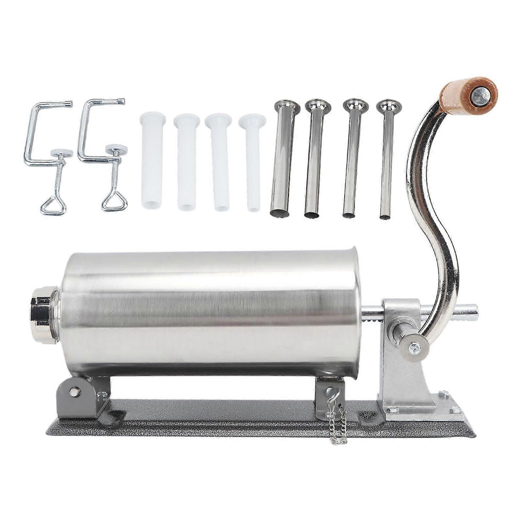 Description: Stainless Steel Body: The entire body of this Sausage Stuffer is made of sturdy stainless steel. It is reusable.Horizontal Base Design: This Sausage Maker features a sturdy horizontal base design, ensuring stability during sausage production. The horizontal design also makes it more labor saving.Includes a Set of 8 Tubes: Comes with 4 stainless steel tubes and 4 plastic tubes. The diameters of the stuffing tubes are 14mm, 18mm, 21mm, and 25mm, allowing you to make sausages and Italian sausage in different sizes.Detachable Parts for Easy Cleaning: This Sausage Filler is easy to disassemble for cleaning after each use. You can remove all rotating parts and funnels from the barrel and clean them with warm water and detergent before drying them for next use.Easy Operation: This 3L sausage stuffing machine can be easily operated by a person in a short amount of time, making it highly efficient for repeated use. Specification: Product Size:?25.5cmx11.5cm/10.04inchx4.53inchPackage Size:?40cmx18cmx13cm/15.75inchx7.09inchx5.12inch Package Includes: 1 Sausage Stuffer4 Stainless Steel Tube4 Plastic Tube2 Clamping Screw1 Handle1 Instruction Manual Note: Please allow slightly errors 1-2cm differences due to manual measurement.