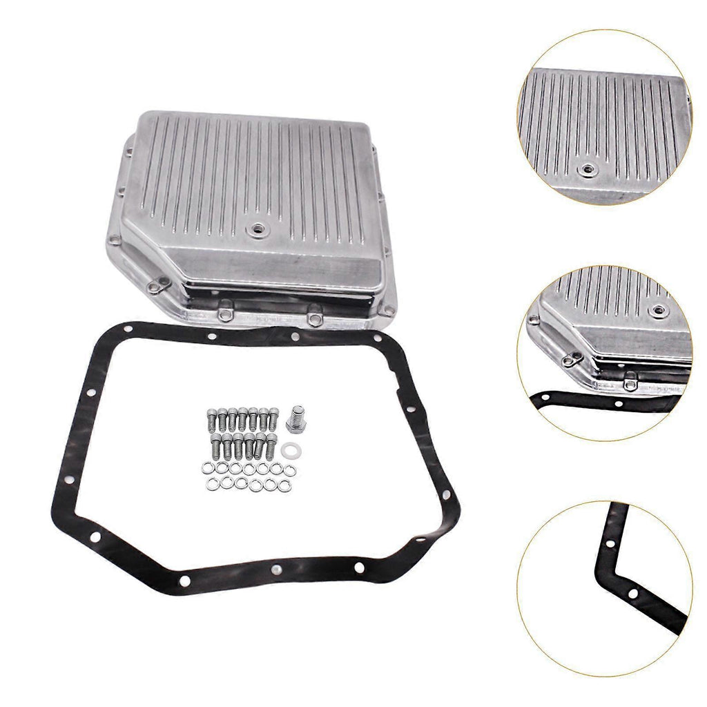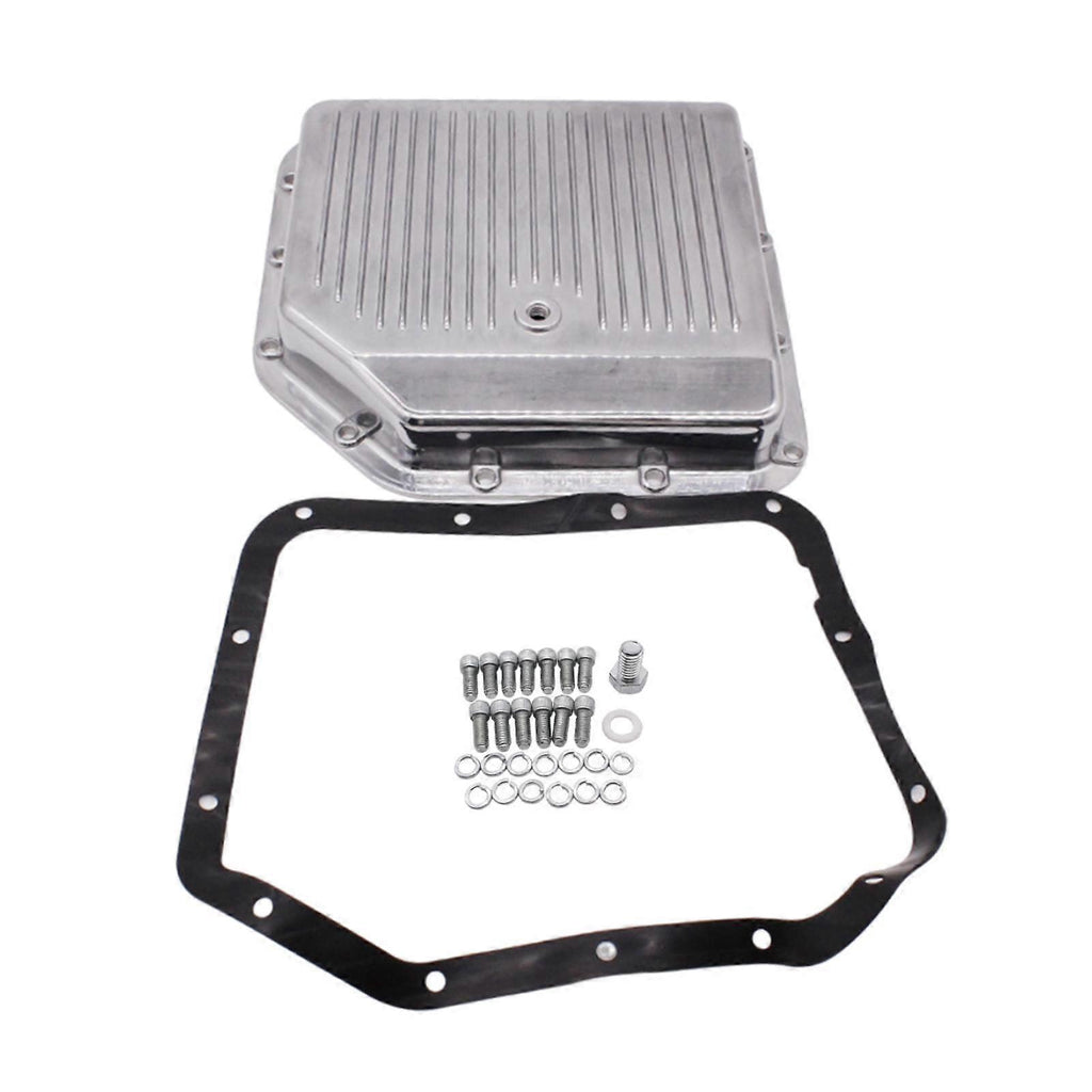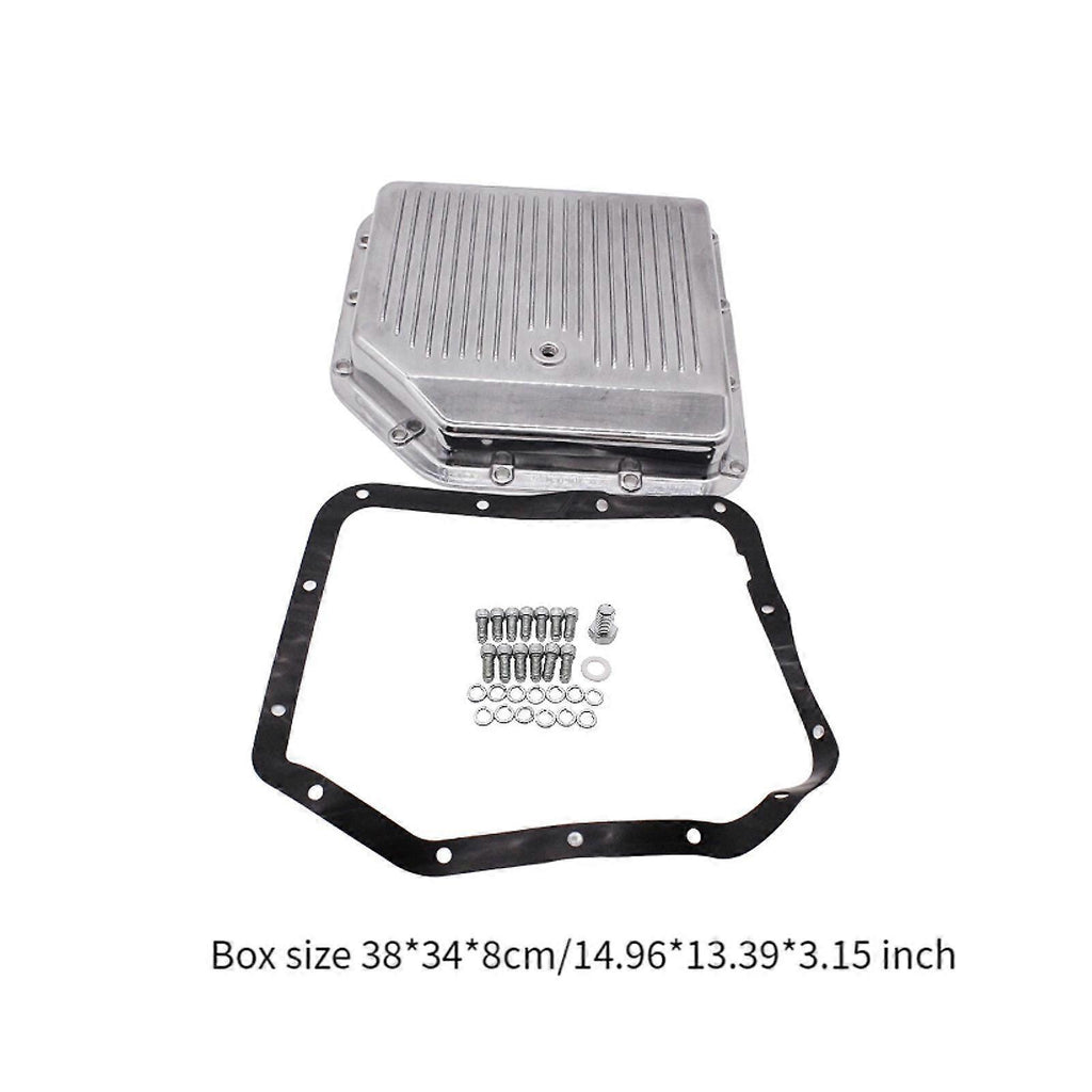 Description: Product Type: Finned transmission pan kit, automotive accessories. Suitable for Chevy TH350 transmission.Premium Material: The transmission pan is made of premium aluminum material, wear resistant, sturdy, and ensures a long time to use.High Performance: Professional manufacturing auto transmission pan, stable performance, has a long service life.Easy Installation: Directly replace the transmission pan set, professional installation is recommended.Package Including: 1 transmission pan, 1 black frame, 14 screws, 13 iron ring and 1 rubber ring. Specification: Packing size: 38cmx34cmx8cm/14.96inchx13.39inchx3.15inchMaterial: Aluminum Package Includes: 1?Transmission Pan Set Note: Please allow slightly errors 1-2cm differences due to manual measurement.