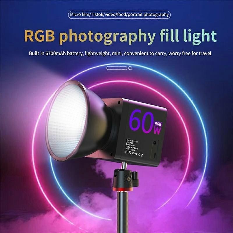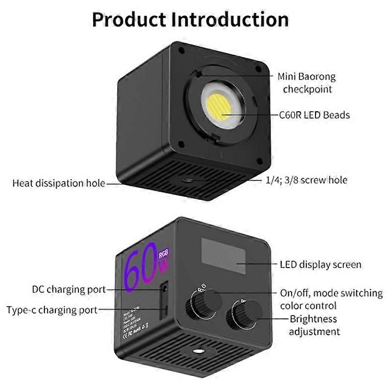 C60R 60W RGB Stage Lamp Professional Video Photography COB Fill Light With 8 Batteries 1. Compact & Portable: Lightweight and easy to handle, this handheld COB fill light is perfect for outdoor and mobile photography needs 2. Powerful & Adjustable: With a color temperature range of 2500K to 6500K. Achieves up to greater or equal to 19700 LUX brightness at 0.5 meters, and features a high CRI of greater or equal to 95 for accurate color 3. Built-In Battery & Fast Charging: Includes four 18650 batteries for up to 1.5 hours of use. Supports Type-C fast charging and DC input (20V-3A) for flexible, rapid recharging 4. Versatile Modes: Offers three modes: CCT, FX, and HSV for varied lighting effects and adjustments to meet different shooting requirements 5. Durable & Efficient: Weighs 660g and measures 105x105x95mm, combining robustness with portability for reliable performance Specifications: 1. Mode: CCTFXHSV 2. Power: 60W 3. Color temperature range: 2500K-6500K 4. Power input: USB-C fast charge (need to support 20V protocol)DC 20V 3A 5. Battery life: 1.5 hours (8 batteries) 6. Battery capacity:6700mAh 7. Charging: Type-C interfaceDC port 8. Color rendering index: Greater or equal to 95 9. Maximum brightness: Max greater or equal to 19700 LUX, 0.5m distance, dark room 10. Net weight: 850g 11. Dimensions: 105 x 105 x 95mm