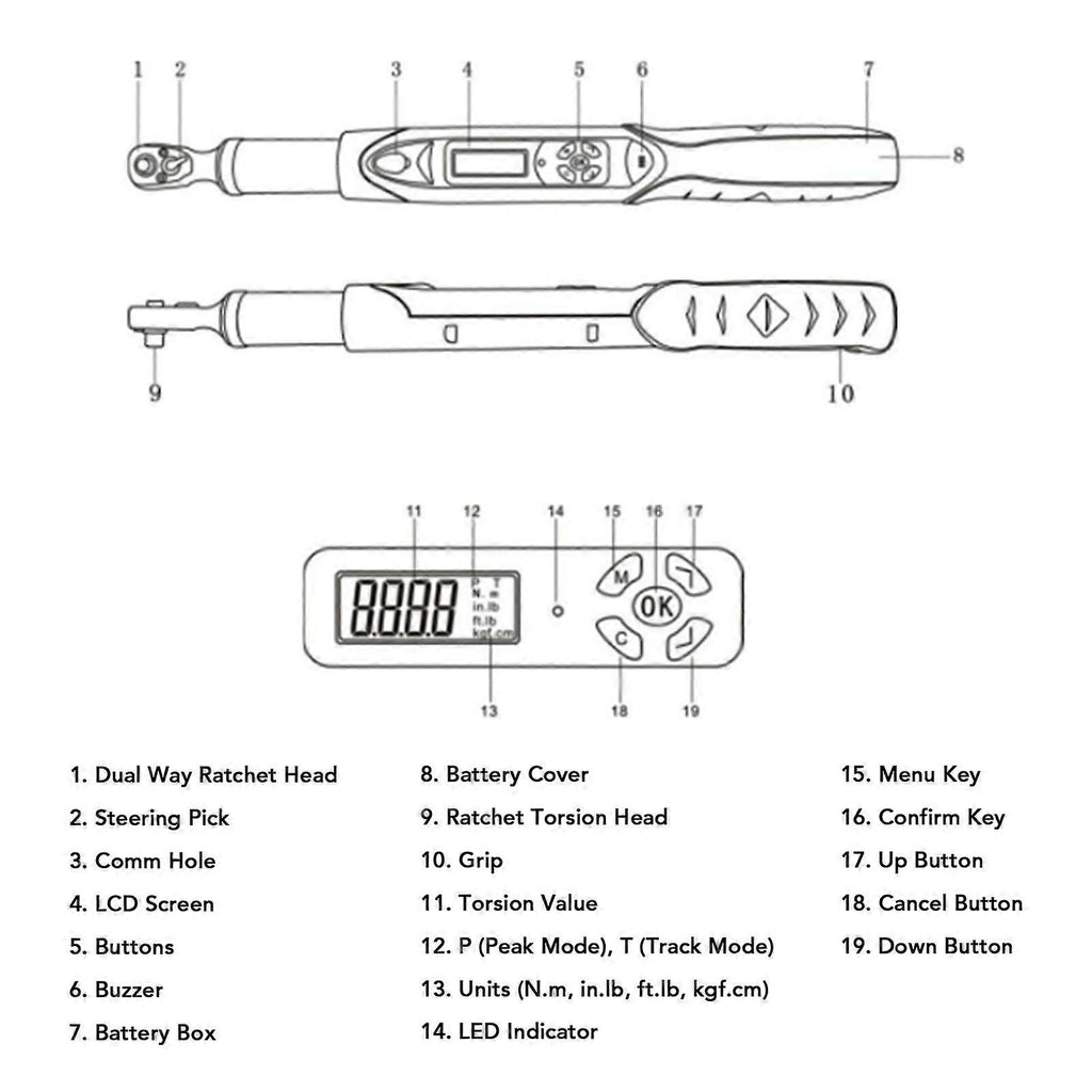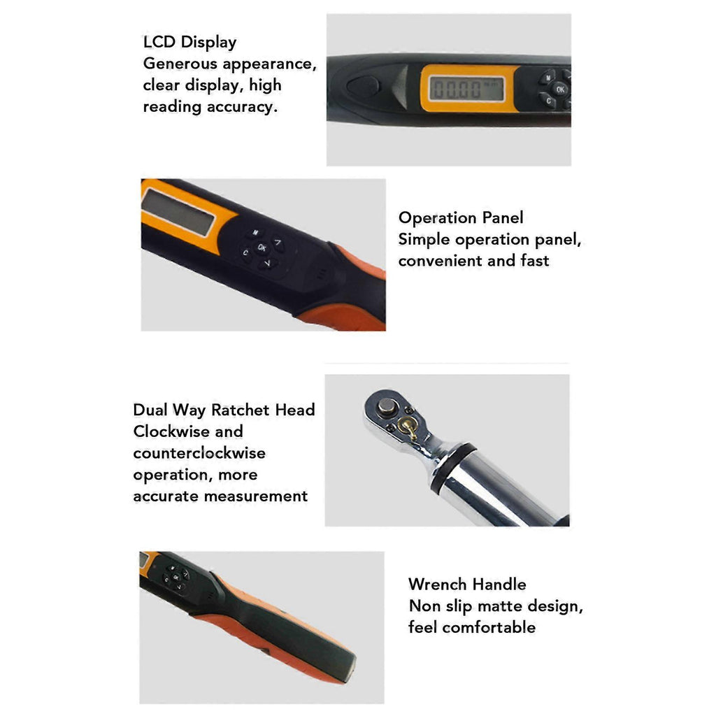 Feature:1. HIGH ACCURACY TORSION WRENCH: 1/2 inch drive digital torsion wrench, with a buzzing setting range of 20.4340N.m. The accuracy in the clockwise direction is 2%, and the accuracy in the counterclockwise direction is 2.5%2. PRESET VALUE AND DATA STORAGE: The digital torsion wrench has a preset value mode and 100 sets of data storage functions, which can preset and store 6 sets of torsion and angle values.3. BUZZER AND LED INDICATOR: When you approach the target torsion, the wrench will sound a warning, the buzzer will sound a regular beep, and the LED indicator light will change from flashing green to a stable red light.4. MEASUREMENT MODES: This torsion wrench provides 4 real time measurements within the range of Nm, in lb, ft lb. kg cm. In trace mode, you can apply a balancing force by changing the display value. In peak mode, record the generated torsion value.5. LOCKING AND SLEEP MODE: This torsion wrench has a lock mode to avoid accidental contact with numerical values. There is also an automatic sleep mode, which automatically enters sleep mode after 2 minutes when you are not using it.Specification:Item Type: Digital Torsion WrenchMaterial: Stainless Steel, RubberBattery Type: 2 x AA Battery (Not Included)Maximum Operating Range: 340N.mDrive Head: 1/2 inchBuzzer Setting Range: 20.4-340N.mAccuracy: Clockwise: 2%, Counterclockwise: 2.5%Ratchet Head Teeth: 36Number of Buttons: 5Operating Temperature: -10-60Storage Temperature: -20-70Humidity: Up to 90% no condensation.Package List:1 x Digital Torsion Wrench1 x Battery Cover Key1 x User Manual1 x Storage BoxNote:1. The accuracy assurance range is 20 to 100 percent of the maximum operating value, the last digit 1 not counted. Torsion accuracy is the normal value. Calibration accuracy is based on the middle slot of the top 5 slots on the handle. To ensure accuracy, it is recommended to calibrate once a year.2. Life testing includes horizontal and vertical tests3. Once refers to applying force to the wrench from 0N.m to the maximum operating setting of the wrench, and then back to 0N.m.4. Since the digital angle torsion wrench automatically saves the previous historical data, be sure to clear the historical data and reset the new data you want before each use.