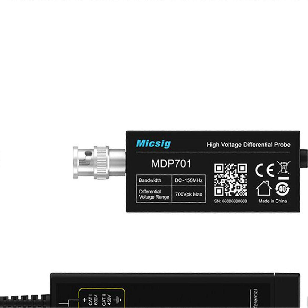 Feature:1. [Exceptional Performance] The high voltage differential probe delivers ultra low noise, excellent amplitude frequency characteristics, and common mode rejection capabilities, enabling users to effortlessly test high frequency and high voltage signals.2. [5MHz Bandwidth Limit] The MDP probe effectively eliminates high frequency noise when measuring the FET switching frequency in most switch mode power supplies.3. [Multi Function] By shorting the test leads and pressing the zero button, the probe can be zeroed rapidly. Dual range selection function improves signal to noise ratio and meets a wide range of testing requirements.4. [BNC and USB Interface] Equipped with standard BNC interface, this oscilloscope probe can be used with any oscilloscope. Can be powered directly from the oscilloscope USB port via a Type C cable.5. [Audible and Visual Alarm] The flashing LED and rapid beeping of the buzzer serve as quick alerts for overvoltage, ensuring safe usage and preventing damage to the probe and equipment.Specification:Item Type: High Voltage Differential ProbeMaterial: ABSVoltage: 100-240VModel: MDP701Bandwidth: 150MHzRise Time: 2.33nsAttenuation: 20X 200XAccuracy: 2%Maximum Input Differential Voltage (DC+AC pk): 70V (20X), 700V (200X)Maximum Ground Voltage: CAT I 600V, CAT II 450VBase Noise:Full Bandwidth: 20X: 0.9mVrms, 200X: 0.4mVrms5MHz Bandwidth Limitation: 20X: 0.4mVrms, 200X: 0.35mVrmsCommon Mode Rejection Ratio: DC: >-80dB, 100kHz: >-60dB, 10MHz: >-30dB, 100MHz: >-26dBDelay Time: 11.99ns (20X), 12.27ns (200X)Input Impedance: 16M/1.5pF (Differential), 8M/3pF (Single Ended to Ground)Output Voltage: 3VPower: 2WPower Supply: Type C InterfaceOverload Indication: LED Alarm, BuzzerControl Module Size: Approx. 91x33x15mm/3.58x1.30x0.59inSignal Box Size: Approx. 100x36x20mm/3.94x1.42x0.79inInput Cable Length: Approx. 8cm/3.15inOutput Cable Length: Approx. 120cm/47.24inTemperature: Operating: 0 to 40, Non Operating: -30 to 70Humidity: Operating: 5% to 85%RH (0 to 40), Non Operating: 5% to 85%RH (40); 5% to 45%RH (40 to 70).Package List:1 x High Voltage Differential Probe2 x Crocodile Clips1 x Type C Cable1 x User Manual2 x Extendable IC Clips1 x PlugNote:Manual measurement may result in slight size errors.
