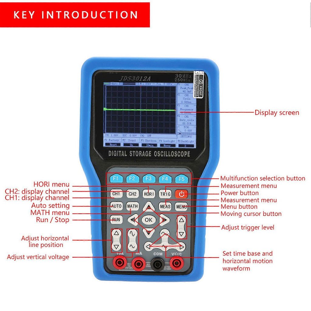 Features:1. Thisinstrument combines oscilloscope, signal generator, multimeter in one, powerfuland practical.2. Adopting advancedARM processor and dual chips, it has high-performance sampling channel that canachieve sampling rate of 250MSa/s and maximum bandwidth of 30MHz.3. You canobserve signal data by serial port center.4. Color TFT screendisplays clear and stable waveform.5. Support forfirmware program upgrade via USB.6. With edge trigger function, it can automatically detect (support 50Hz-60MHz).7. Multiplewaveform math addition functions.8. Supportautomatic shutdown function and power saving mode: time can be set.9. Waveformscan be saved as screenshots and imported to the computer via USB.Specification:Brand: JinhanModel: JDS3012APower supply: 1 * 18650 3.7V 3600mAh battery (not included)Item Size: 22.6*13.8*4.0cm / 8.9*5.4*1.6inWeight: Approx. 1372g/48.4ozOscilloscope:Max samplingrate: 250MSa/SChannel: 1analog channel + 1 digital channelBandwidth: 30MHzVerticalresolution: 8bitVerticalaccuracy: 3%Input range: 10mV-5V(Probe 1X), 100mV-50V (Probe 10C), 1V-500V (Probe 100X) (1, 2, 5 Step)Input impedance:1M25pFInput coupling:DC/ACDisplay mode:Y-TTime Range: 10ns-50ms(1,2.5step), 100ms-5s (scan)Storage depth:16KptsTrigger mode: Auto,Normal and SingleTrigger Type:Rise, DownAutomaticdetection: Support 50Hz-60MHzMeasurement: Thepeak to peak value, duty cycle, frequency, cycleScreen: 4.3inch 16 bit true color TFT 400*272Multimeter:Max display: 6000countsDC current: 60.00mA/600.0mA,6.000A/10.00A.AC current: 60.00mA/600.0mA,6.000A/10.00A.Resistance: 600.0, 6.000k, 60.00k, 600.0k, 6.000M, 60.00M.Capacitor: 40.00nF,400.0nF, 4.000uF, 40.00uF, 400.0uF, 4000uF(30sec).Diode: 0V~2.0V.On-offdetection: in 600geardetection, buzzer when less than 30 Signal Generator:Frequency: 0Hz- 10MHzDuty cycle: 0%- 100%Amplitude: 100mV- 4VOffset: 0V - 2VSerial Center: Baud rate: 115200- 1200Data bits: 8,9Parity bit: NO,ODD, EVENStop bit: 1, 0.5,2, 1.5Hex: 10, 16Recorder: Time base: 100ms- 5sPackage list:1 * Oscilloscope1 * Battery Charger1 * CD1 * Screen Protector1 * USB Cable1 * Protective Cover4 * Identification Ring1 * BNC to alligator clip test cable1 * Oscilloscope Probe2 * Multimeter Probes1 * Black Bag