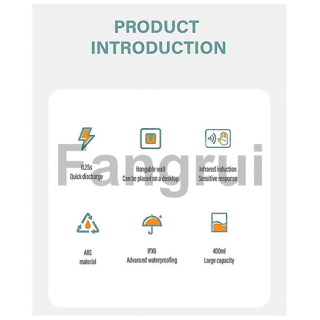 Fangrui Product Details Fangrui Product Details Description/features: 1. Can Be Hung Or Placed On The Desktop 2. Reach Out And Bubble Automatically In 0.25 Seconds 3. The Second Level Of Foaming Volume Can Be Adjusted By Touch Switch 4. New Sensor Chip That Is Sensitive And Prevents -spraying 5. 400m Large Capacity Can Be Filled About 500 Times Specifications: Discharge Induction Speed: 0.25s Input: Dc-5v Sensing Distance: 0-60mm Rated Power: 1.5w Working Temperature: 5 C-45 C Battery: Built-in Lithium Battery Waterproof Grade: Ipx6 Power On: Touch Power On Working Humidity: ~ Size: 18.5 X 9.5cm Material: Plastic Colour: White Package Contents: 1 X Foam Cell Phone Wash 1 X Usb Cable 1 X English Instruction Manual 1 X Wall Hanging Sticker Only The Above Package Content, Other Products Are Not Included. Note: Light Reflection And Different Displays May Cause The Color Of The Item In The Picture A Little Different From The Real Thing. The Measurement Allowed Error Is +/- 1-3cm.