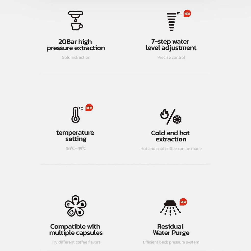 Features 1????6 IN 1 Coffee Maker??This upgrade coffee maker work with Nes capsule, DG capsule, ESE pod, Kcup pod, ground coffee and tea. Suitable for home, office use. 2????7 Water Volume Selectable and Hot and Cold Brew??Espresso coffee maker supporting 7 leves of water volume selection. One button to switch cold and hot brew. Making coffee is more easier and professional such as Latte, Cappuccino, Americano, espresso and latte art.  3????Rapid Heating??The mini coffee maker with 1450W high power, precise temperature control and stable pressure. Making delicious coffee for you in 40s, time and effort saving for coffee beginners and lovers. 4????More Pure Taste??Precise 92?? temperature control to ensure pure taste. 20 Bar pump pressure, rich oil extraction and mellow taste to satisfy your higher taste requirements. Built-in anti-dry protection. 5????Easy to Use and Clean??Espresso coffee maker with clear water tank, removable water tray and dirt-resistant and wear-resistant shell. Easy to maintain, clean and durable.  Specifications Specification: Color: Black / Beige (optional) Plug type: EU plug / US plug / UK plug(optional) Voltage: 220V(EU plug) / 110V(US plug) Power: 1450W 50/60Hz Water pumping pressure: 20Bar Size: 26*11*26cm/10.23*4.33*10.23in Weight: About 3kg/105.82oz Package List Packing List: 1 * Coffee maker 6 * Adaptors 1 * Power cable