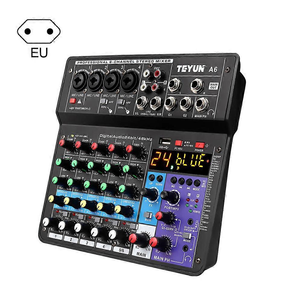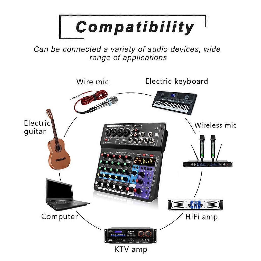 and high quality Features: "The unique features of A6 mixer" Built-in high-speed ARM chip with unique low noise and voice change,Modification, reverberation, delay, electronic sound effects and other processing technologies. "Multifunctional and convenient mixer"Combined digital sound card, tuning sound effects,MP3 player, USB player, built-in Bluetooth-compatible real-time monitoring,Multi-input reverberation effect 48V power supply for high, middle and . "Suitable for many occasions"Can be used for stage performances, bands, conference rooms, recording studios, bars and other occasions. "USB playback function"Support audio devices with USB interface, lossless sound quality playback,All in A6 analog digital mixer. "Analog mixer combined with digital sound cardFlexible LOOPBACK function, perfect for recording and webcasting,Using LXR combination microphone input interface,the level can be seen in the recording state, which is convenient for flexible adjustment at any for time. "Compatible and powerful"Can be connected to a variety of audio equipment, a wide range of applications. Specification: LED indication: MAIN STEREO LEVEL knob, the green light is on when the MAIN LEVEL signal reaches -10dB, and the red light is on when it reaches 3dB below the distortion Input and output level: MIC (-60dB) LINE OUTPUT (-40dB) MAX OUT (+12dB) USB audio: 2IN/2OUT USB audio 2.0 compatible, decoding rate: 48.1kHz, Bit depth: 24-bit Effect category: independent volume adjustment effect: true digital effect processing Phantom power supply voltage: support large diaphragm condenser microphone Voltage adapter: for DC 5V/2.0A standard Materials:Metal+ABS Package Size: app.27.3*8.2*26CM/10.92*3.28*210.4in Optional Styles&Colors: 1, 2, Quantity: 1set Package includes: 1*Mixer, 1* a manual (Chinese/English) optional 1* power supply with the same wire 1* power adapter