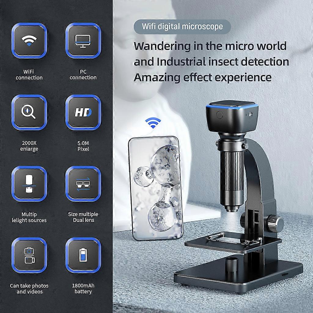 Features: Two lenses for different use:500x low magnification metal detection lens, suitable for circuit board maintenance and inspection, printing inspection, identification of jade and pre-cious stones, etc;High magnification 2000x metal microscope lens, for Ideal for microbial observation, section observation and plant disease and insect observation. Wifi & Usb two connection methods, can be connected to computer and cell phone to watch, support photo and video functions. Usb for dc charging and 18650 battery dual power supply mode adapt to more occasionsscenarios. 10 bright led lights and 1 super bright led light The upper light source observes the real object, the lower light source observes the specimen, the for image is more three-dimensional and clear. An anti-slip foot pad is added to the bottom to make observation more stable. Specifications: Material:ABS Pixel: 5.0m pixels Magnification: 0X-2000X Lens: 500x low magnification lens 2000X high magnification lens Wi-Fi connection distance: 5m (open environment) Working height: 0-70mm for Focus mode: manual for focus Button for focus range: 2mm-55mm USB interface type: usb2.0 Data format: jpg / mp4 Light source: 10 bright led lights + 1 super bright led light Battery capacity: 1800mah Operating system: for mac 10.8 or above, android 8.0, ios 8.0 or above for windows xp vista, win7 / 8/10 Note: The battery is contained inside. Please allow 0-1cm error due to manual measurement. Make sure you do not mind before you bid. Due to the difference between different monitors, the picture may not reflect the actual color of the item. Thank you! Package includes: 1 x WIFI Microscope 1 x 500x low multiple lens 1 x 2000x high multiple lens 1 x Manual 1 x USB cable.