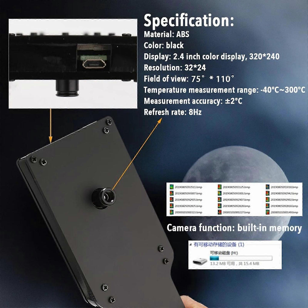 Features: Built-in rechargeable lithium battery, Micro USB port. The refresh rate is 8Hz, the temperature range is -40~+300, and the operating environment is 0~50. 2.4-inch LCD screen, resolution : 320x240. The screen displays the maximum temperature, minimum temperature, central point temperature and all coordinate points. Built-in memory for taking 100 photos. After connecting the Micro USB cable to your computer, you can view, copy, and delete images on your computer. Can be used for human body temperature detection, PCB components heating temperature detection, floor heating temperature detection, auto parts temperature detection, electrical switch temperature detection, air conditioning microwave oven detection, etc. Specifications: Material: ABS Size: 160x56x20mm/6.3x2.2x0.79in Resolution: 32 x 24 View: 75 110 Temperature range: -40 C to 300 C Measurement accuracy: 2 Refresh rate: 8Hz Without calibration Emissivity: 0.1~0.99 adjustable Battery: 1x lithium battery, 1000mAh (inclusive) Charging time: about 2 hours Power supply: Micro USB 5V/1A Operating temperature: 0~50 Note: Please allow 1-3cm error due to manual measurement. pls make sure you do not mind before you bid. Due to the difference between different monitors, the picture may not reflect the actual color of the item. Package includes: 1X Thermal Imager