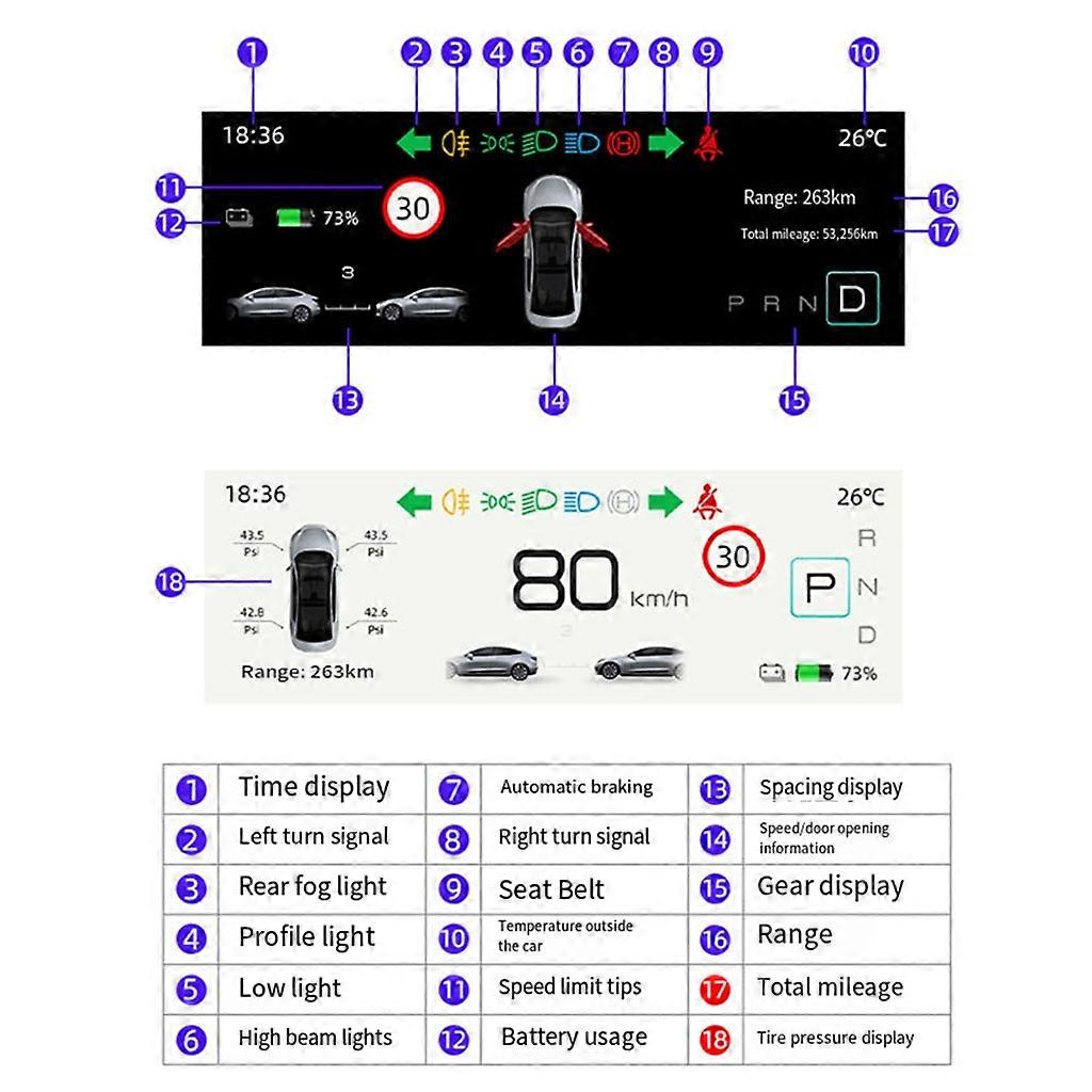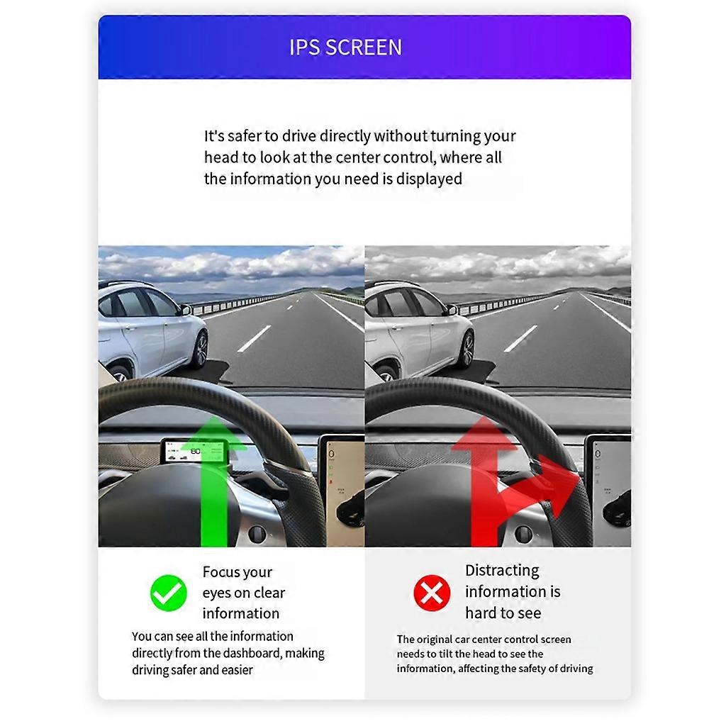 Features: Digital instrument cluster is designed with 4.6 inch screen, no blocking front view. Real-time display car information, such as speed, gear position, belt reminding, battery left percentage, high and low beam light, temperature & parking. No need to look at the center screen for vehicle information, provide a safer- driving. Easy installation, no drilling required, no damage to install, plug- and play-. Compatible- for tesla- ModelY/3. Specifications: Material: plastic Note: Please allow 1-3cm error due to manual measurement. please make sure you do not mind before you bid. Due to the difference between different monitors, the picture may not reflect the actual color of the item. Package includes: 1xHead Up Display