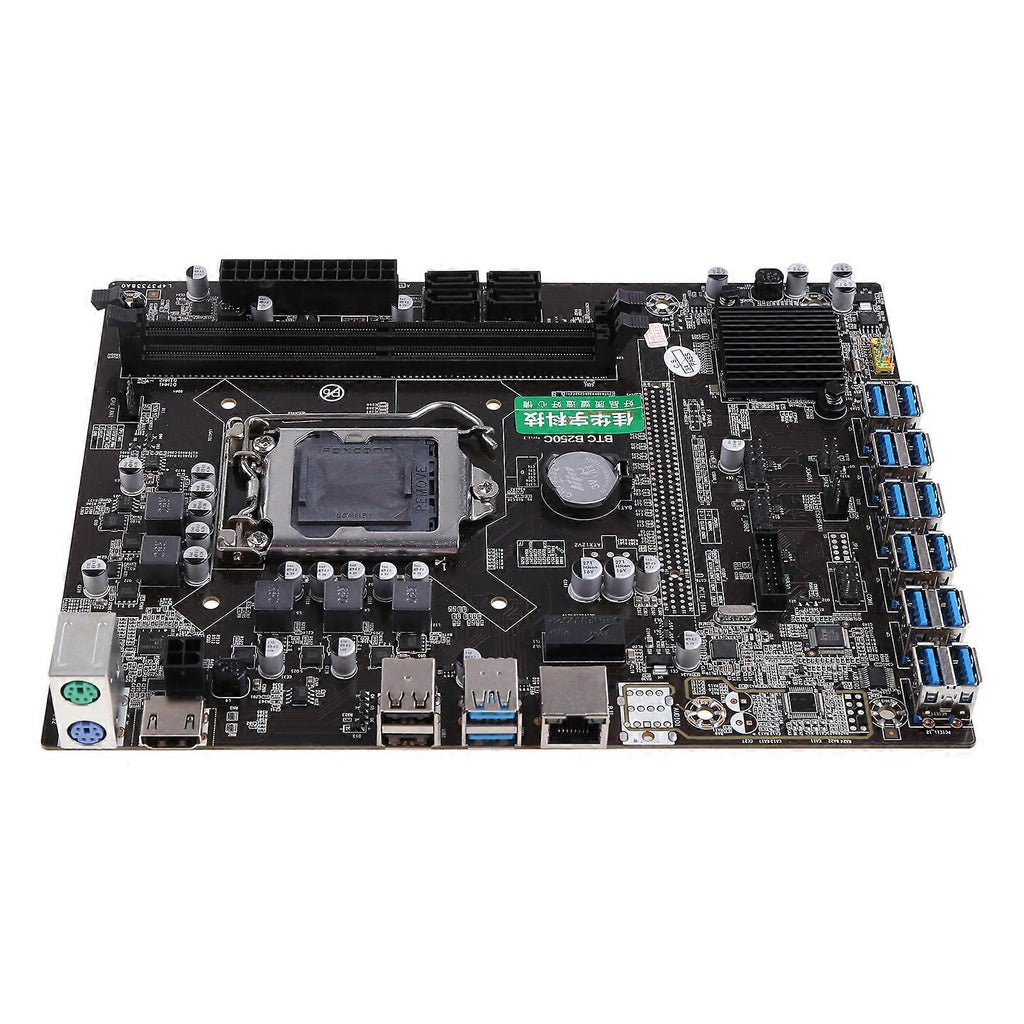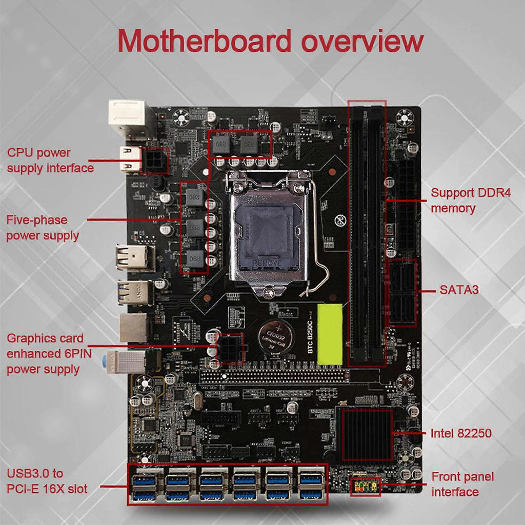 Features: and high quality Innovative design, convert PCIE 16X directly to USB3.0 interface, reduce intermediate transmission links, reduce costs, reduce signal attenuation, and make continuous long-term work more stable. Upgrade to compatible for HDMI compatible high-definition display interface, convenient and practical. Support for Core 6th and 7th generation CPUs, LGA1151 is easy to use, low cost, low investment, and efficient mining. This product uses high quality materials, is durable, has a long service life, and is sturdy and stable in use. Expansion of 12 USB3.0 ports, plug and for play, convenient and hassle-free. Specifications: Product model: B250C BTC 12P Processor: Supports all processors of the LGA1151 series Chipset: Use for Intel B250 high-speed chipset Memory: 2 x DDR4 DIMM memory slot, support 2133/2400MHZ memory, maximum support 16GB Display chip: integrated for Intel High Definition Graphics core graphics card Display output: for HDMI compliant/12xUSB3.0 to PCI-E16X Network: 1 x RTL8111F Gigabit Ethernet chip Storage: 4 x SATA hard disk interface Audio: Onboard ALC662 6-channel high-fidelity audio controller I/O interface: 2 x USB3.0 interface; 4 x USB2.0 interface; 1 x for HDMI compatible interface; 1 x RJ45 gigabit network interface; 1x 3 in 1 audio interface; 1 x PS/2 interface Built-in I/O interface: 1 x USB3.0 pin; 2 x USB2.0 pin; 1 x COM pin; 1 x AUDIO front audio pin; 1 x F-PANEL front panel function button and indicator plug Needle BIOS: AMI 64mb Flash ROM Power supply type: support ATX 24P + ATX 4P, 12V + ATX 6P Size: approx. 23x17.5cm/9.05x6.88in Note: The appearance of different batches of products may be different, which does not affect the use. Please allow 0-1 inch error due to manual measurement. Thanks for your understanding. Monitors are not calibrated same, item color displayed in photos may look slightly different from the actual item. Package includes: 1PC x Motherboard 1PC x CPU Cooling Fan (No CPU, Lot appearance may vary) 1PC x Switch Cable (Random Color)