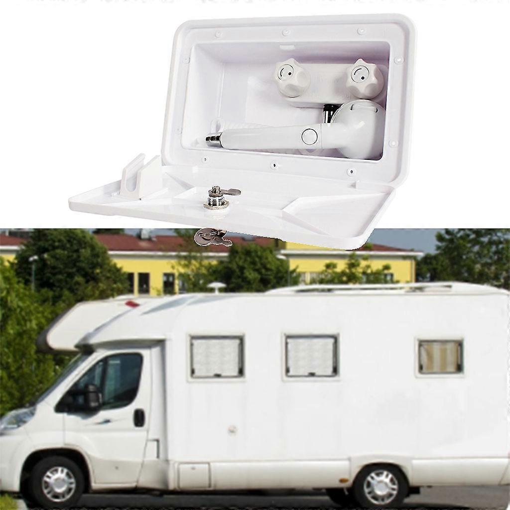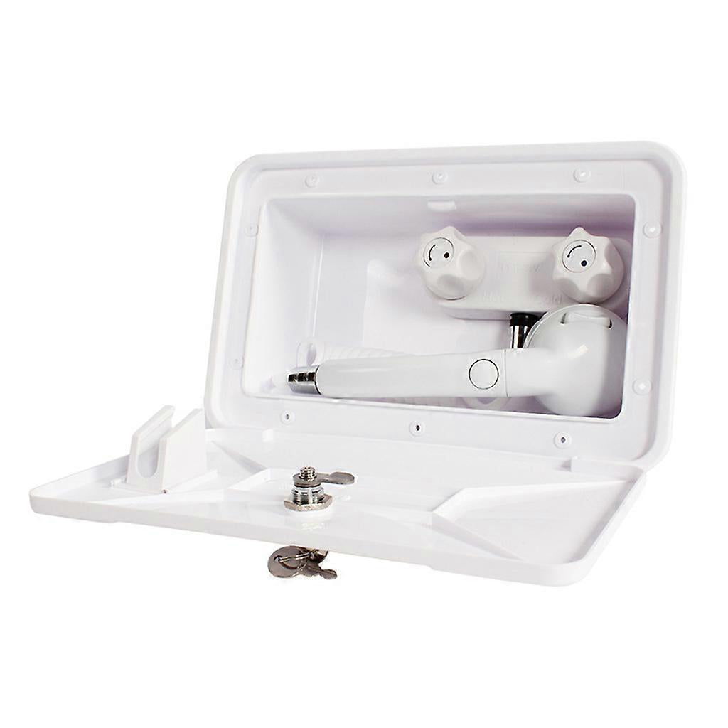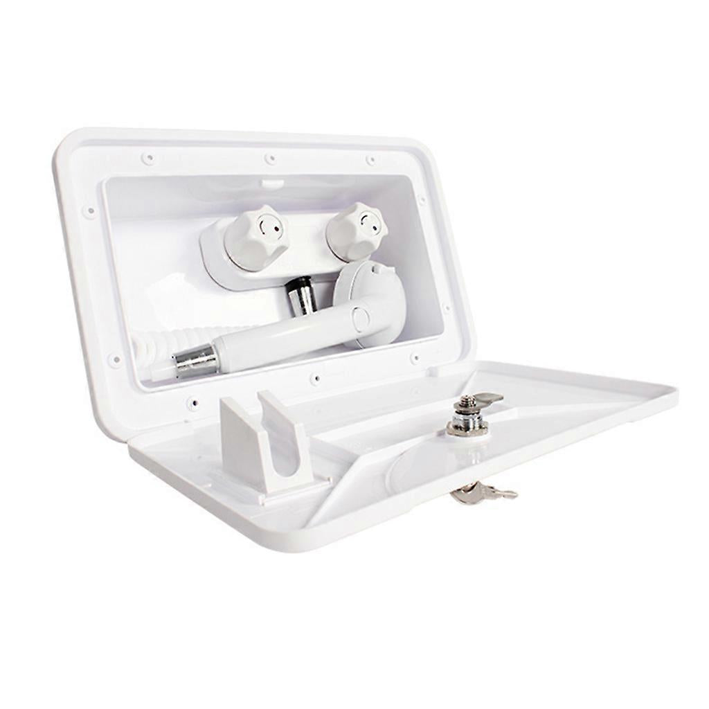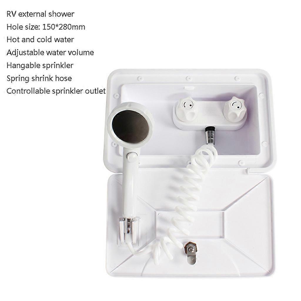 Features: and high quality Both hot and cold knobs for precise control over water temperature. This quick connect faucet also features an easy to connect nozzle so you can easily get your hose attached without any fuss. Attaches securely to your RV with long, durable studs. Unit screws into the cutout from the outside face - Screws are covered when door is closed,for Key lock ensures security. Adjustable cold water and hot water, convenient for daily use. Spring hose, automatically shrinks when not in use, no need to tidy up the hose. The sprinkler for head is switched on and off independently, and the sprinkler for head is turned on when in use, without the need to switch water to the for valve. Specifications: Material:ABS Size:Approx.33.8x21.6x12.7cm/13.31x8.5x5in Net Weight:1000g Note: Please allow 1mm errors due to manual measurement. Due to the difference between different monitors, the picture may not reflect the actual color of the item. Package includes: 1x RV Exterior Shower Box