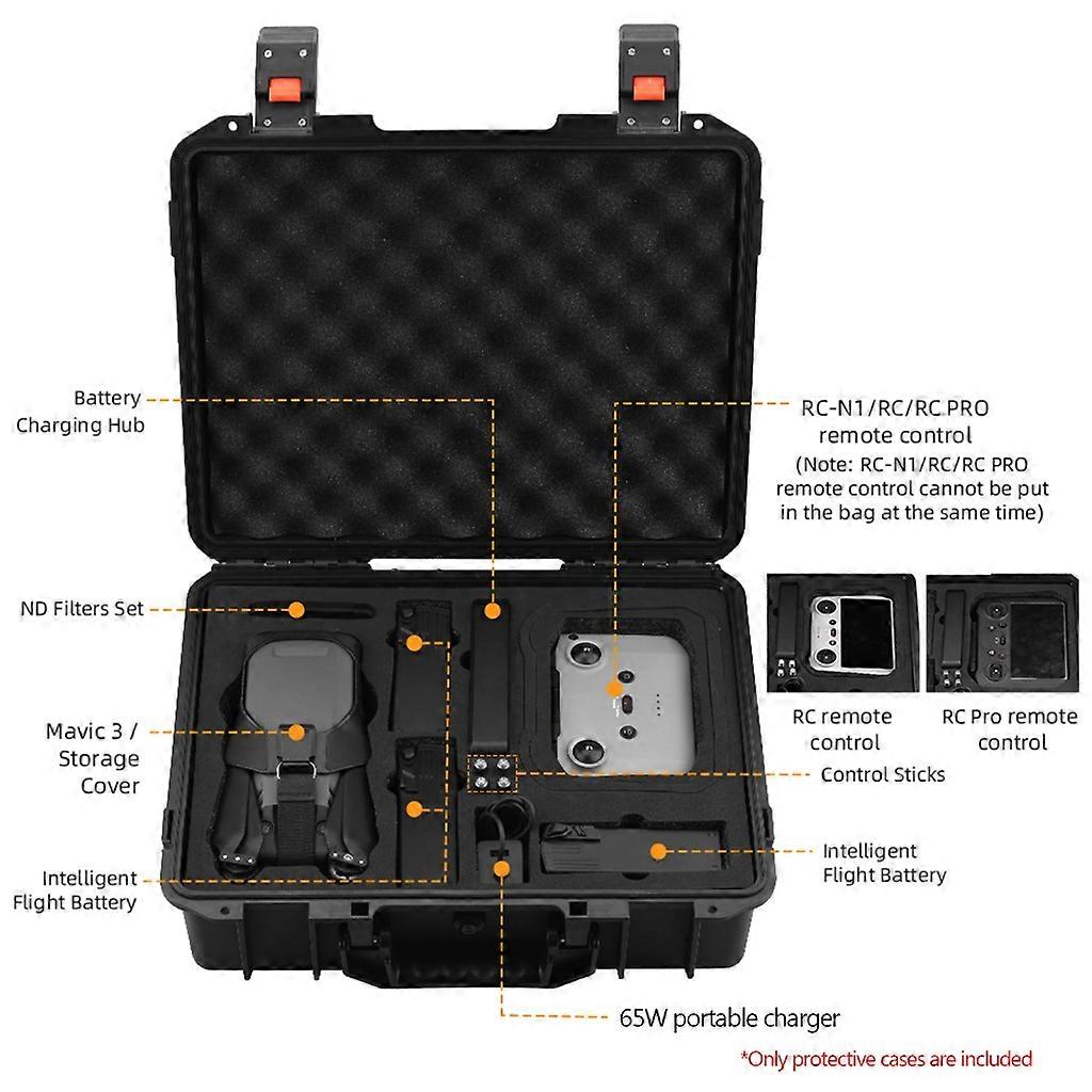 Features: Waterproof, compressive, strong and durable. Liner is made of pearl cotton to prevent damage to the machine. Shell is made of ABS material, durable for long-term use. A pressure spring inside the lock, which can make the lock open and close comfortably, easy to use. Applicable for Mavic 3 Classic, RC-N1, RCwith screen remote control, RC-PRO with screen remote control. Specifications: Material: ABS Applicable Models: for Mavic 3 Classic, RC-N1, RCwith screen remote control, RC-PRO with screen remote control Color: Black Net Weight: about 1683g Size: Approx. 40.5x33.5x12cm/15.9x13.2x4.72inch Note: Other demoed accessories in the pictures are not included. RC-N1 / RC-Screened Remote Control / RC-PRO Screened Remote Control cannot be placed in the storage bag simultaneously. Please allow 0-1cm error due to manual measurement, make sure you do not mind before you order. Please allow slight chromatic aberration due to different display resolutions. Package includes: 1 Piece Explosion-proof Box