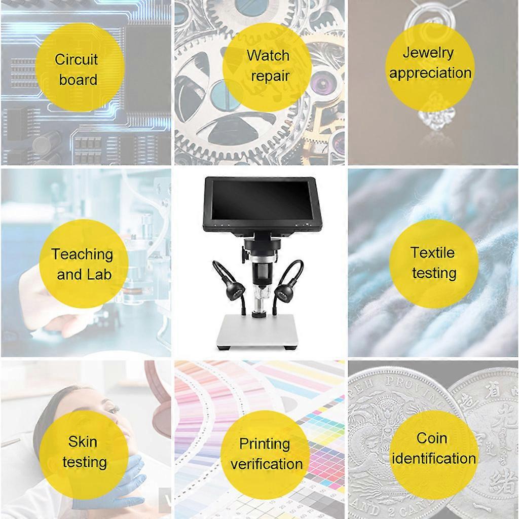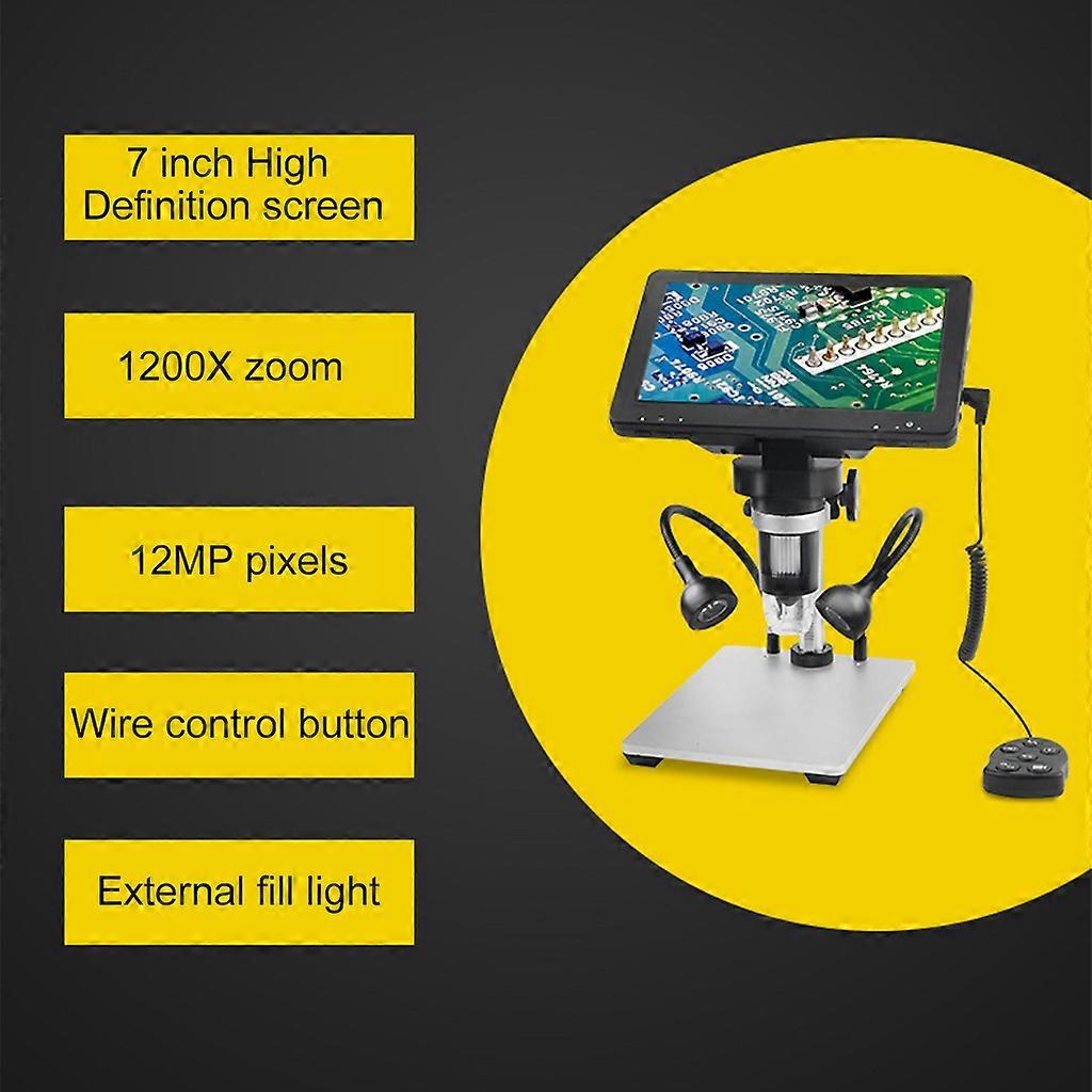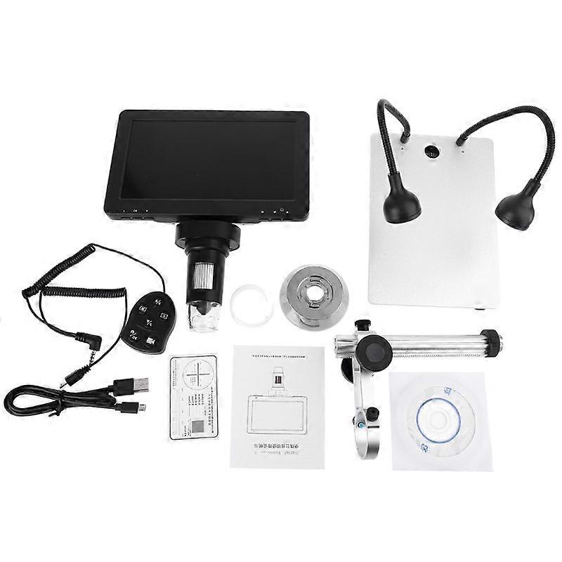 7 inch Digital Microscope 1200X 12MP Camera Magnifier Long Object Distance for PCB/SMD Repair Soldering with wire control Product model: DM9 Video resolution: 1080FHD 1080P 720P Pixel: 12MP Screen size: 7 inches Camera resolution: for 3M 5M 8M 10M 12M Supported languages: English, Portuguese, Japanese, French, German, Korean, Italian, Russian, Dutch, Arabic, Chinese Simplified, Chinese Traditional PC operating system: for Windows xp, win7, win8, win10, for mac OS x 10.5 or higher 6 advantages - 7-inch high-definition large screen, the for image is clearer - The screen can be rotated and the display angle can be adjusted up to 270 - The ultra-long working distance (Max.10cm) is conducive to spot welding by mobile phone maintenance, circuit board inspection, etc. - Remote button remote control - External fill light - Free reflector Applications: Circuit board inspection, Watch repair, Jewelry appreciation, Teaching and Research Tools, Textile testing, Skin detection, Printing verification, Coin identification Package included: 1 * Digital Microscope 1 * Bracket Stand 1 * Remote control 1 * Calibration card 1 * Reflector 1 * CD-Drive 1 * Manual (English)