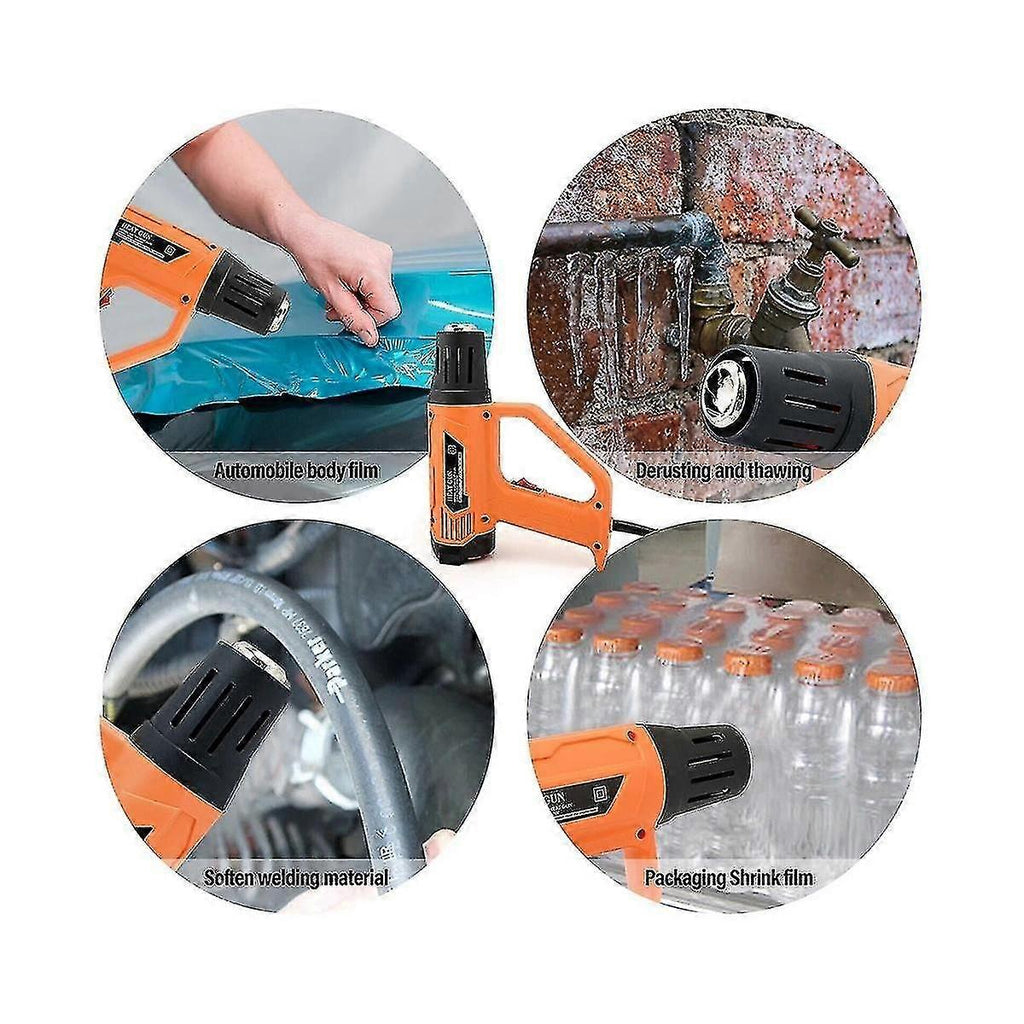 Portable Heat Kit: lightweight compact size heat with high performance, heating up fast and accurately, is and safe to use.Two-speed Temperature Adjustable: with 50~650 range of temperature for adjustment, easy to switch by the control button.Safety Operation: high quality heating and safe operation, heat resisting black front cover protects your hands from scald.6 Kinds of Different Nozzles: also equipped with 6 nozzles to meet your different needs for heating.LCD Digital Display: temperature on LCD display for easy reading when operating, and for better adjusting the temperature.Wide Application: it can be applied in soldering pipes, welding PVC, drying, shrink-fitting, stripping paint, etc.Input Voltage: 110V(US)Output Power: 2000WTemperature Range: 50~650Blast Capacity: 80~550L/minApplication: Remove Paint, Old Wallpaper, Remove Plastic Floor Tile, Bend PVC Pipe, Litter in Pipe, Remove Greasy Litter, Heat Shrink Packaging Film and Tube, Blow the Thread Residue of Clothes in Garment ProductionPlug Type: US Plug, it applies to Canada, , Mexico, Thailand, Taiwan, the , the Philippines and so on.Colour:Photo ColorMaterial:ABSPackage Contents:1 x Hot Air 2 x Scraper6 x Nozzle1 x Manual (English)Only the above package content, other are not included.Note: Light reflection and different displays may cause the color of the item in the a little different from the real thing. The measurement allowed error is +/- 1-3cm.