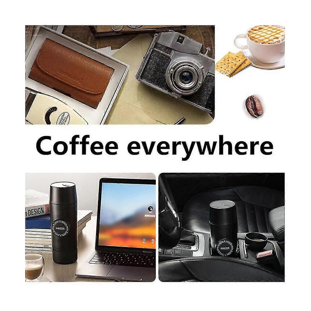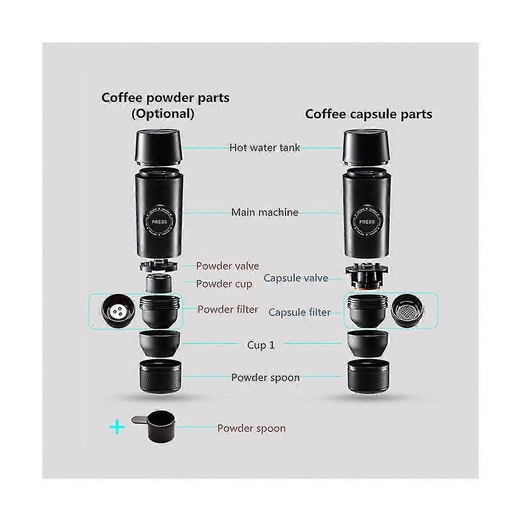 2 in 1 capsule or regular coffee: It only takes to brew a cup of extracted coffee, more attractive than ordinary coffee machines in stores It has non-toxic, food-grade safe and healthy use Electrical automation design: This portable espresso machine is an electric espresso machine for handheld automatic extraction when family outdoors camping or traveling. It has a USB power cord for as it connects . Simple Regular Cleaning: small handheld mini espresso coffee maker does not require any maintenance. The open design makes regular cleaning quick and easy. Stain-resistant and ultra-quiet operation. New experience for camping trips: Lightweight handheld size design-insulated mug. Weighing only 525g, it is convenient to enjoy espresso anywhere. Go camping or traveling without leaving your espresso EASY TO USE: Put 1 scoop of coffee into the filter basket and connect the spout. Turn body and mouth . Pour hot water into the tank and connect it with the main body. Finally, press the button to fill your mug. motorized design for automatic extraction or outdoors Mini Handheld Coffee with Refillable Cup and Water Tank 80ml Capacity This portable coffee maker is a small, handheld mini espresso coffee maker that doesn't require any maintenance. The open design makes regular cleaning quick and easy. Stain-resistant and ultra-quiet operation. This product provides you with an cup of espresso, giving you more control over your coffee preparation, so even the most delicate coffee can be obtained with an espresso. Powered by the included USB power cable. The portable espresso machine has a USB power cord for . It is suitable use or outdoor camping and traveling. The device is lightweight, with a handheld-sized design and an insulated cup. Material: Plastic+metal colour: black Package Contents: 1 x 1 x USB data cable Only the above package content, other are not included. Note: Light reflection and different displays may cause the color of the item in the a little different from the real . The measurement allowed is +/- 1-3cm.