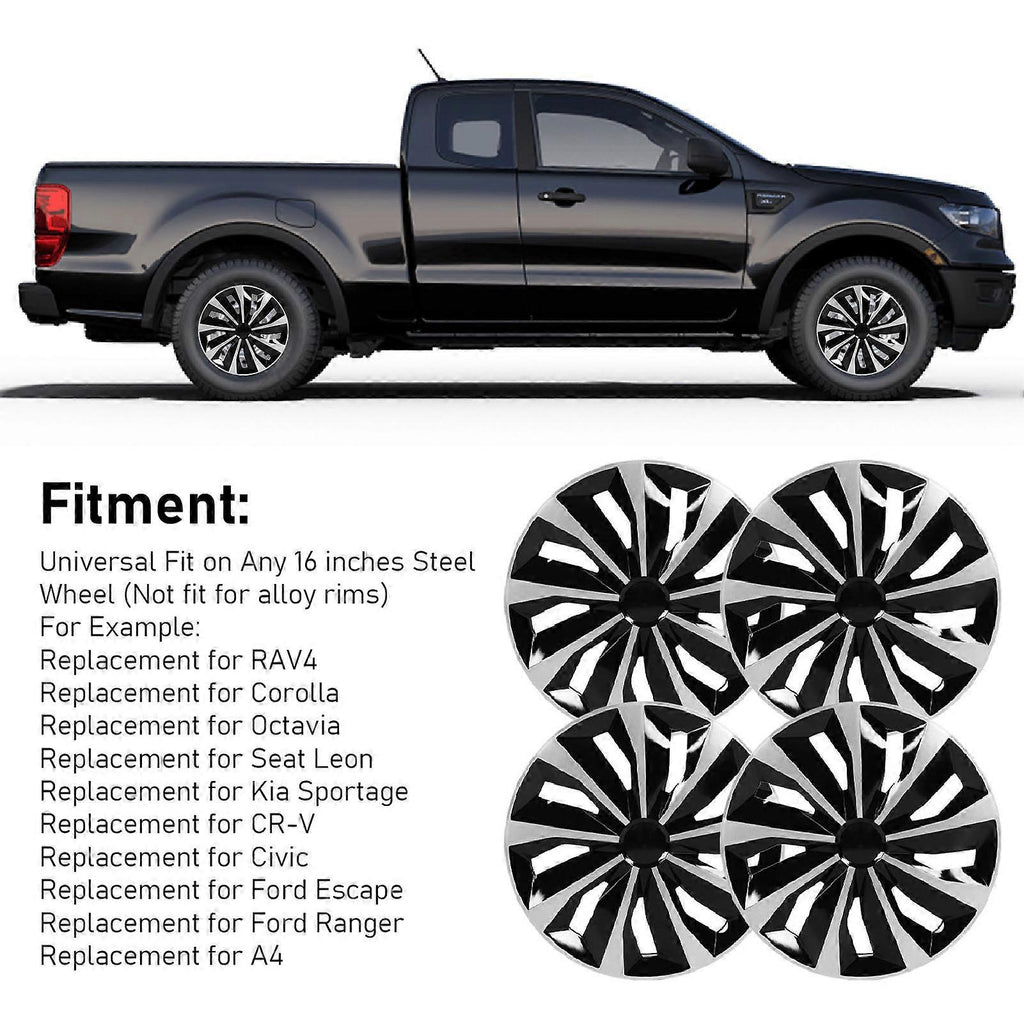Features: 1.Fitment: This 4pcs hubcaps are replacement for RAV4 Corolla; replacement for Ford Escape Ranger; replacement for Seat Leon; replacement for Kia Sportage. 2.Function: Comes as a complete set of 4 hubcaps. They work well to cover up any previous scratch blemishes, and effectively protect your wheel hub. 3.Upgraded Sporty Style: The combination of black and silver is elegant and stylish, asymmetrical style, more sporty, let your car attract the eye on the road. 4.Durable Material: Our hubcaps are made of ABS plastic material, good durability, high strength, with more fixed clamp, avoid falling off when driving. 5.Easy to Install: This hub cap is light and easy to install, no professional installation tools, only need a few simple steps to install, convenient and quick, can be removed at any time. Specification: Item Type: Hubcap Size: 16in Material: ABS Installation Method: Snap On Fitment: Universal Fit on Any 16 inches Steel WheelNot fit for alloy rims For Example: Replacement for RAV4 Replacement for Corolla Replacement for Octavia Replacement for Seat Leon Replacement for Kia Sportage Replacement for CR-V Replacement for Civic Replacement for Ford Escape Replacement for Ford Ranger Replacement for A4 PackageList: 4 x Hubcap