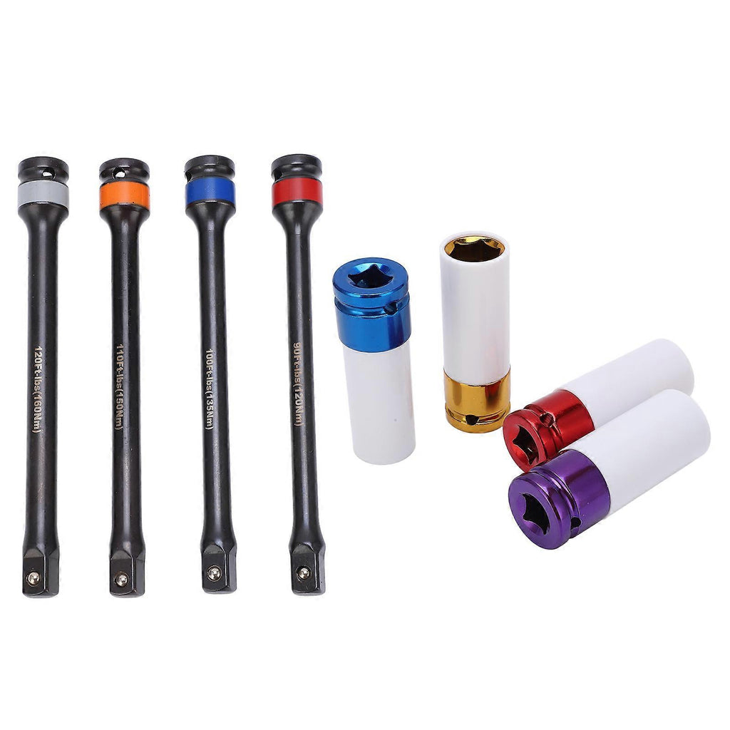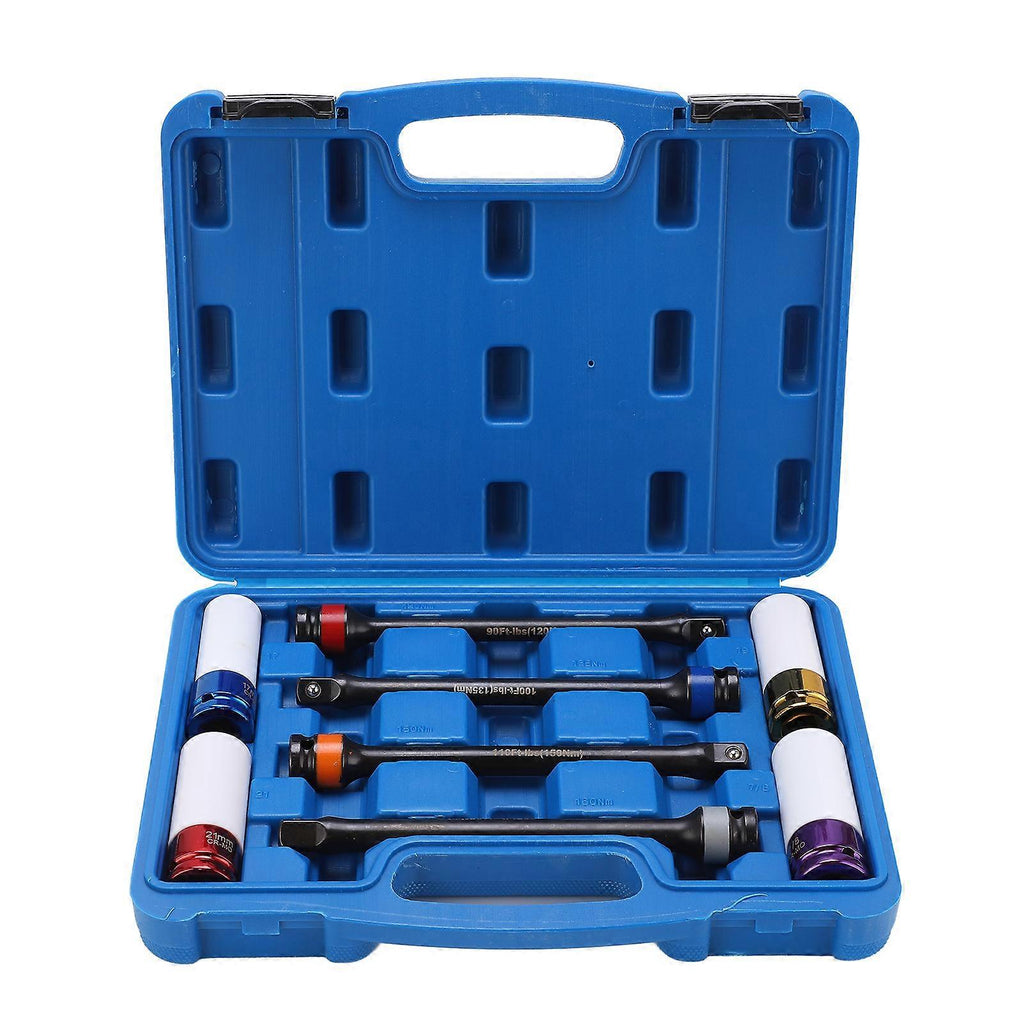 Features: 1.[Save Your Lug Nuts] Perfect for use in places with limited access, the ABN Torsional Limiting Extension Bars and Lug Nut Deep Impact Sockets 8 Pieces Set quickly and safely loosens bolts, nuts, and lug nuts at awkward angles and in difficult to achieve locations without marring or damaging your vehicle. 2.[Secure Hold] Extension torsion bars have a ball on the male end to help hold a socket; Spring loaded ball detent locks to prevent parts from slipping into machinery. 3.[Built to Last] Torsion bars constructed from chromium molybdenum steel (CR?MO) and manganese phosphate for maximum strength and longevity that resists rust and carrion. 4.[Scratch Resistant] White sleeve wheel nut socket constructed from chromium molybdenum steel (CR?MO) with 360?degree non scratch sleeve and insert to protect bolts top, wheel rims, and lug nuts from scratches during use. 5.[Easy Identification] Color coded rings on all pieces identifies each size; Sizing also permanently etch on bar shaft for quick identification. Specification: Item Type: Torsion Stick Set Material: Chromium Molybdenum Steel Specification: 1/2in Square Mouth 120Ft-lbs(160Nm) 110Ft-lbs(150Nm) 100Ft-lbs(135Nm) 90Ft-lbs(120Nm) Sleeve Size: 1/2in DR17mm,19mm,21mm,7/8in Applicable Models: General PackageList: 4 x Extension Torsion Bar 4 x Socket 1 x Toolbox (Packaging)