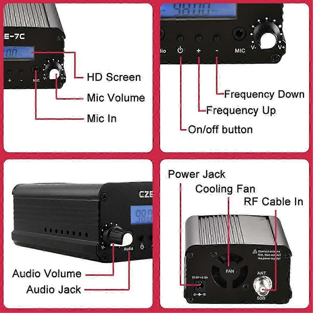 Long Range: Our 7w fm transmitter has a long range in both low and high power modes.No static signal-whether you are in a high-rise apartment in or snuggling in the foothills of Montana, you will find the clearest channel with amazing sound clarity AUX Input: Connect external devices, such as MP3,CDplayers,Mobilephone,Computer, TVBluetooth or wireless adapter input. MICInput: Allows you to use your own wired microphone (or equip Bluetooth transmitter and receiver microphones) Clear and Stable Signal Transmission: Audio distortion is less than 0.25%, supporting clear, strong and stable signal transmission. PLL Digital Tuner Technology: With advanced PLL digital tuner technology, the FM transmitter has no frequency offset, allowing you to enjoy your own radio station. Technical Parameters: Phase Lock Loop (PLL) System Easily choose your frequency LCD and buttons Freq range: 76MHz~108MHz Power: 7w Ripple or harmonic waves: -60dB Tuning Step: 100khz Stability of Frequency: 5ppm Less than 10ppm ( better system) Freq. Response: -55dB(100~5000Hz); -45dB(5000 ~ 15000Hz) Audio Input Connector: 3.5mm headphone connector Microphone jack; it can be connected wih the microphone RF output connector: TNC Female TNC Type antenna output Reduced harmonic ( clean signal ) Reference range: 1-3Km (A barrier-free environment) : More than 60dB Stereo channels crosstalk: -50dB Audio frequency response: 20 to 15000Hz Audio distortion: Less than 2% Power supply voltage: DC 10-14V (12V recommended) Operating current: Less than 2A Plug Type: US Plug, it applies to Canada, India, Mexico, Thailand, Taiwan, the , the Philippines and so on. voltage: 110V Material: plastic colour: Black Package Contents: 1 x transmitter 1 x Antenna 1 Adapter Only the above package content, other products are not included. Note: Light reflection and different displays may cause the color of the item in the picture a little different from the real thing. The measurement allowed error is +/- 1-3cm.